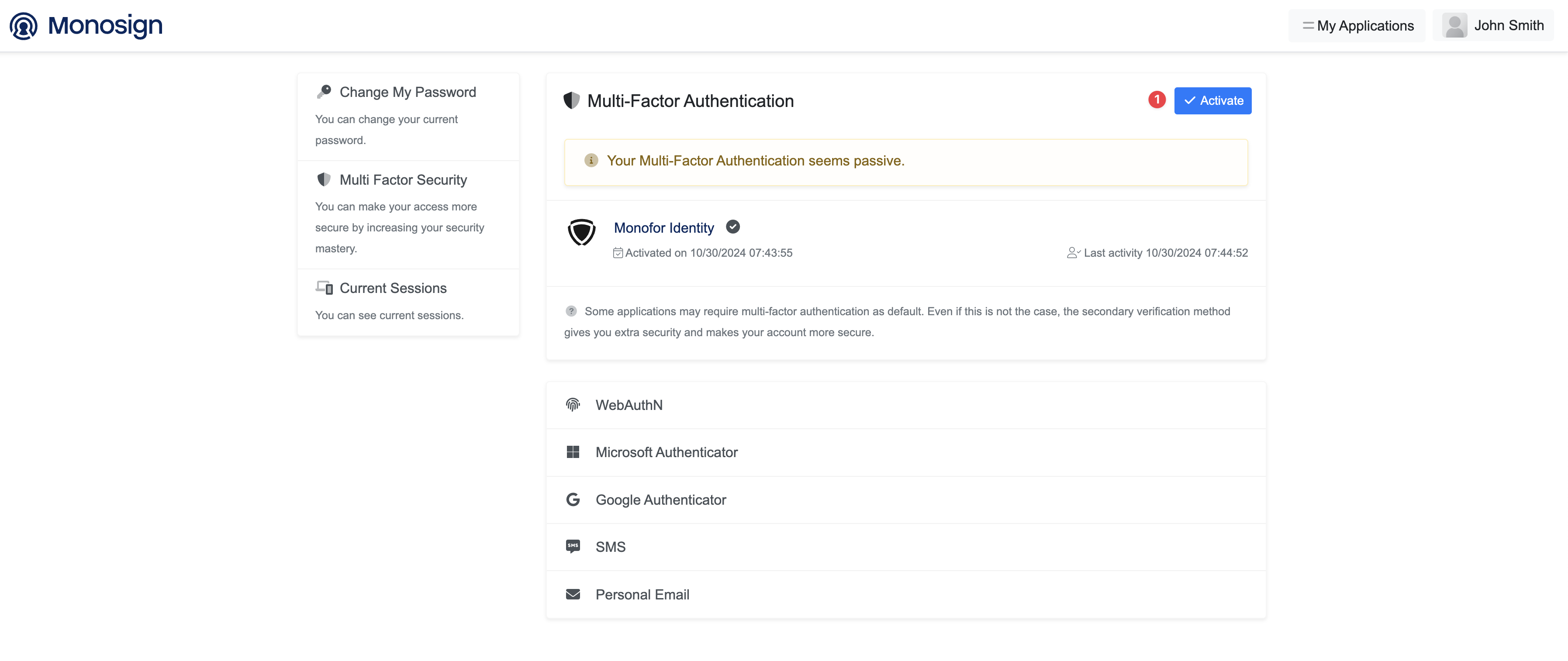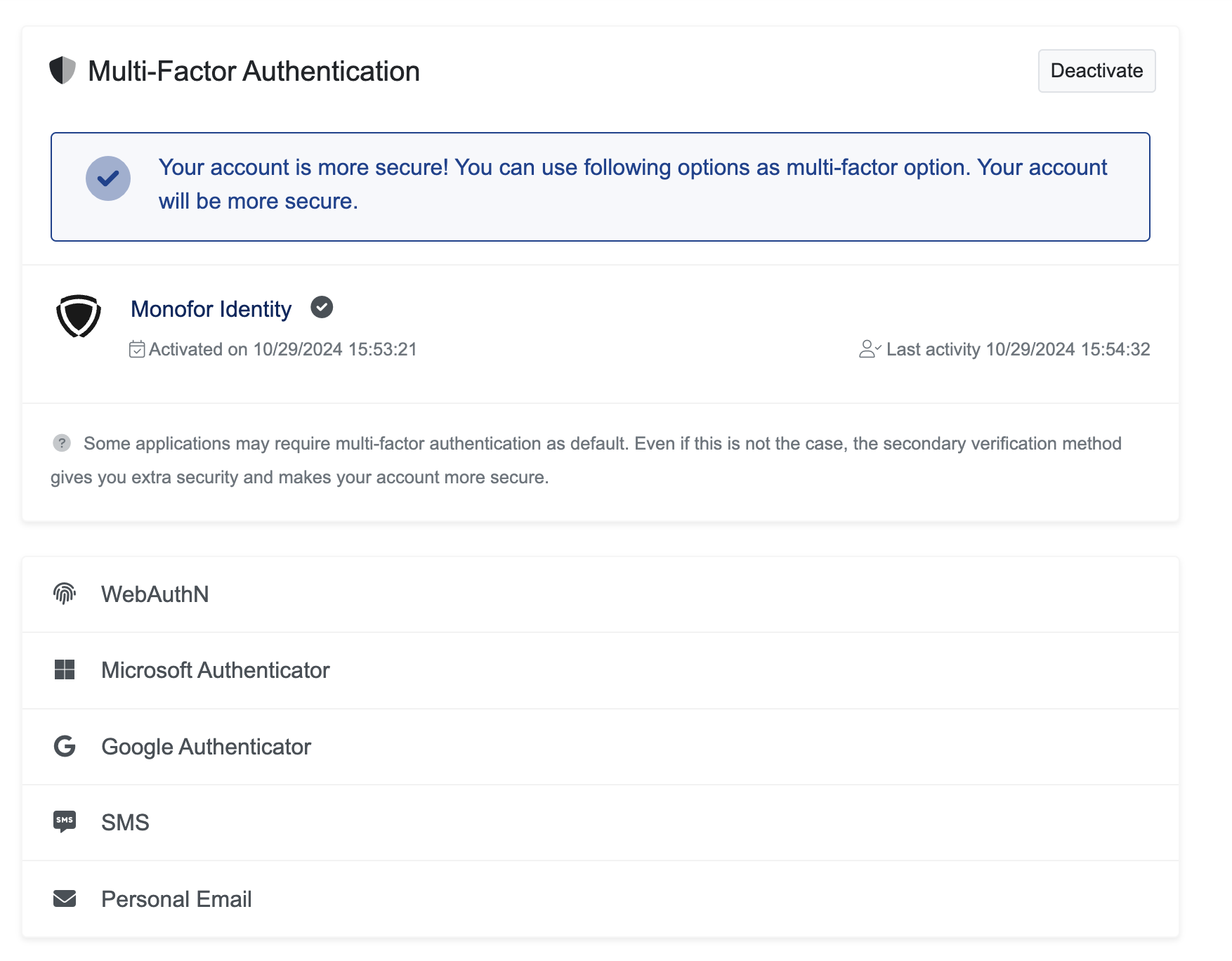 If MFA is not enabled automatically, you can enable it manually by clicking on the Activate button