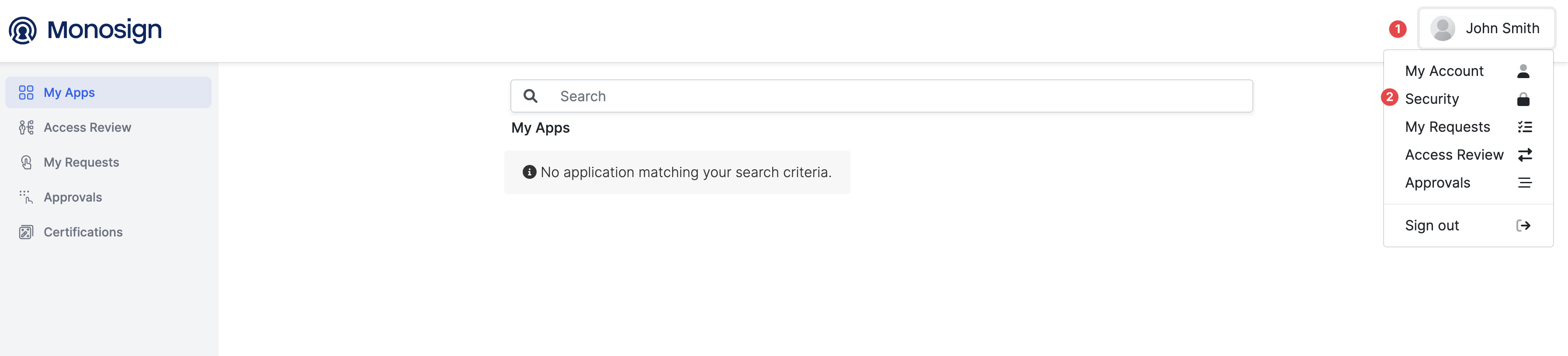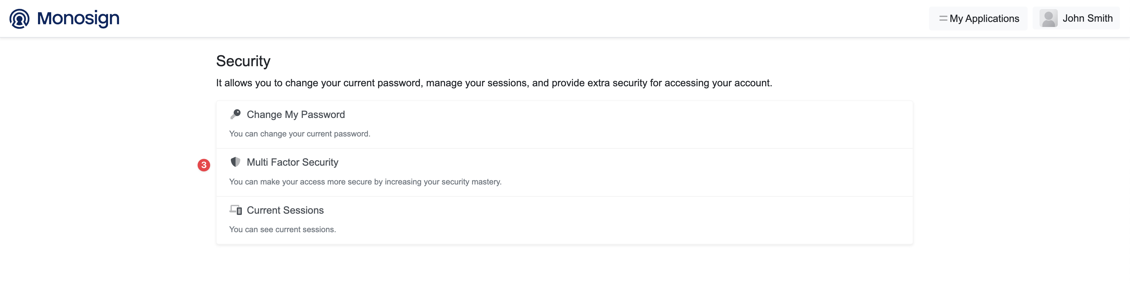 After signing in to MonoSign, click on the username on the right top of the page, and go to Security