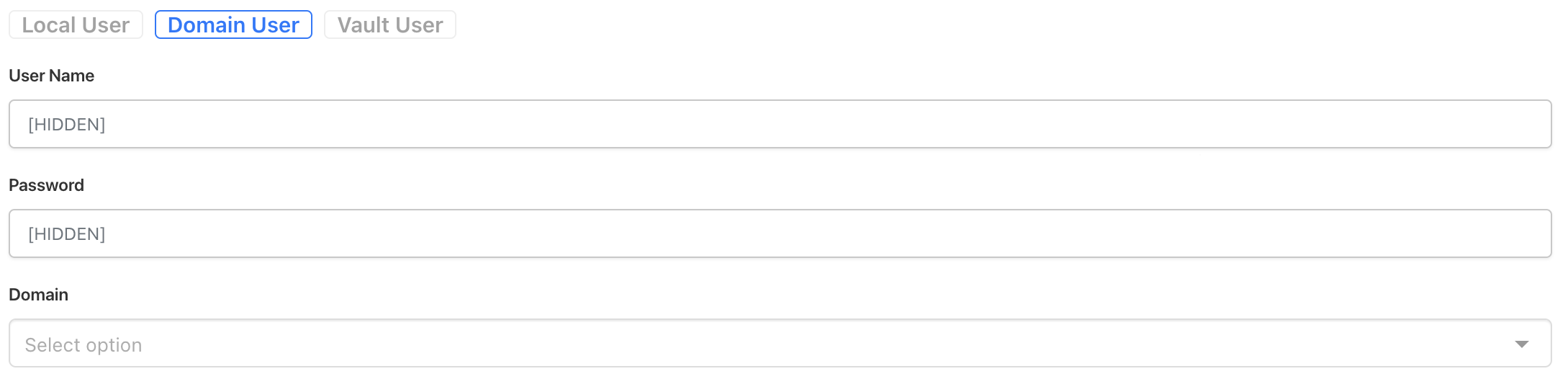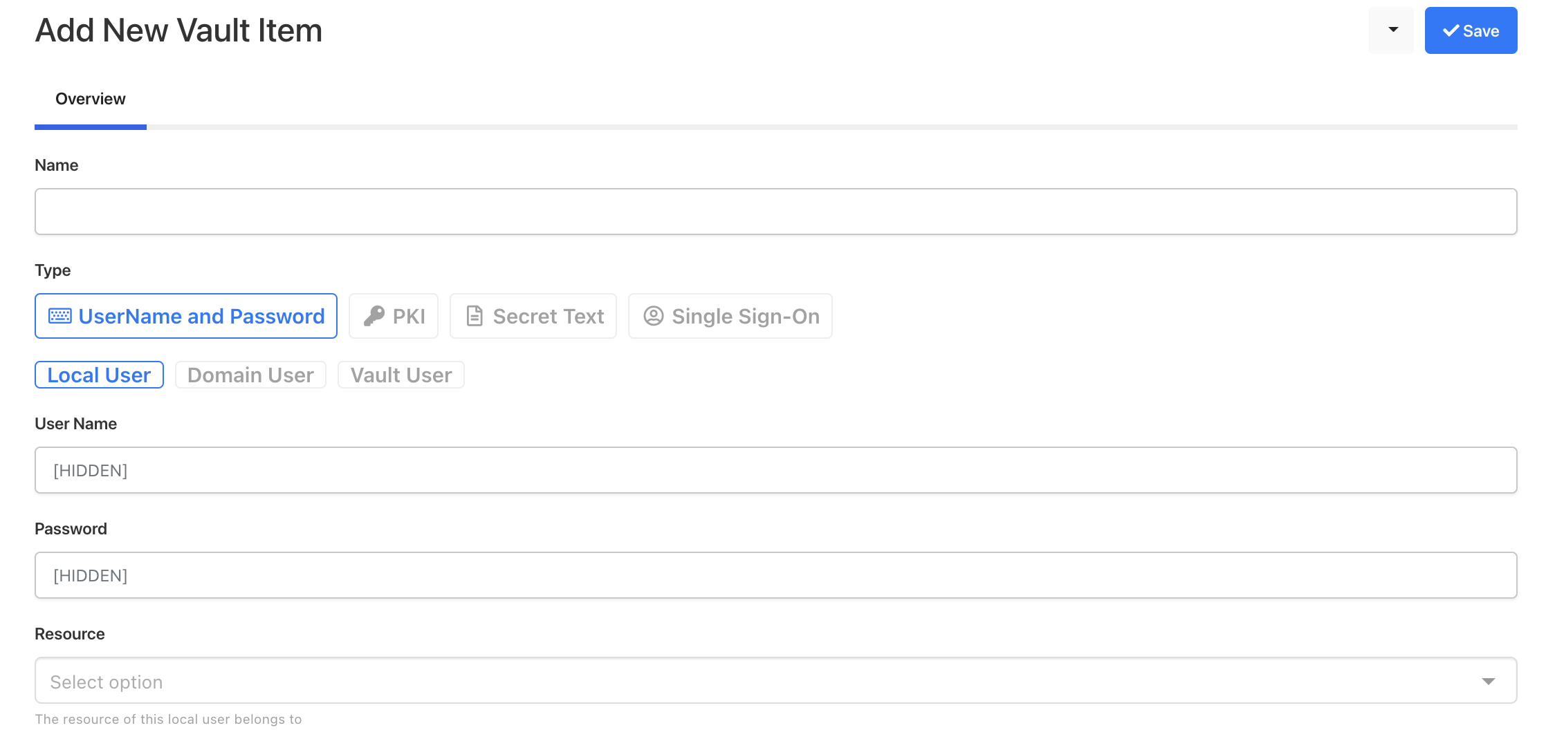A username and password is a basic Username and Password type. It also contains three different subtypes. Local User is just a Username, Password, and Resource to assign, Domain User additionally has Domain name information, and Vault User is a basic Username and Password.