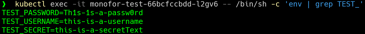 kubectl exec -it monofor-test-66bcfccbdd-l2gv6 -- /bin/sh -c 'env | grep TEST_'