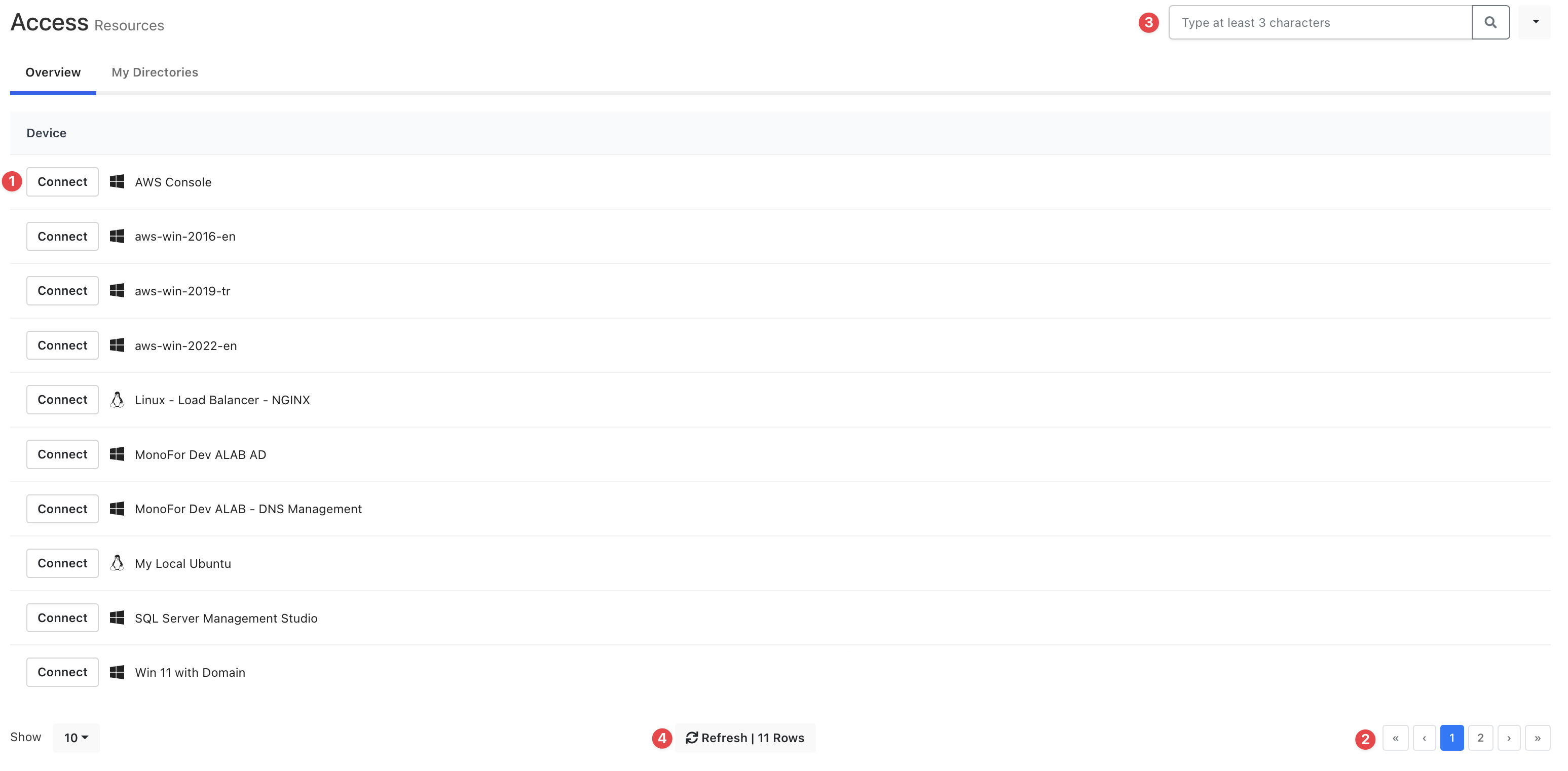 The Overview is a flat list of your resources like servers, web, or desktop apps. You can easily access your resource by clicking the “Connect” option on the UI.