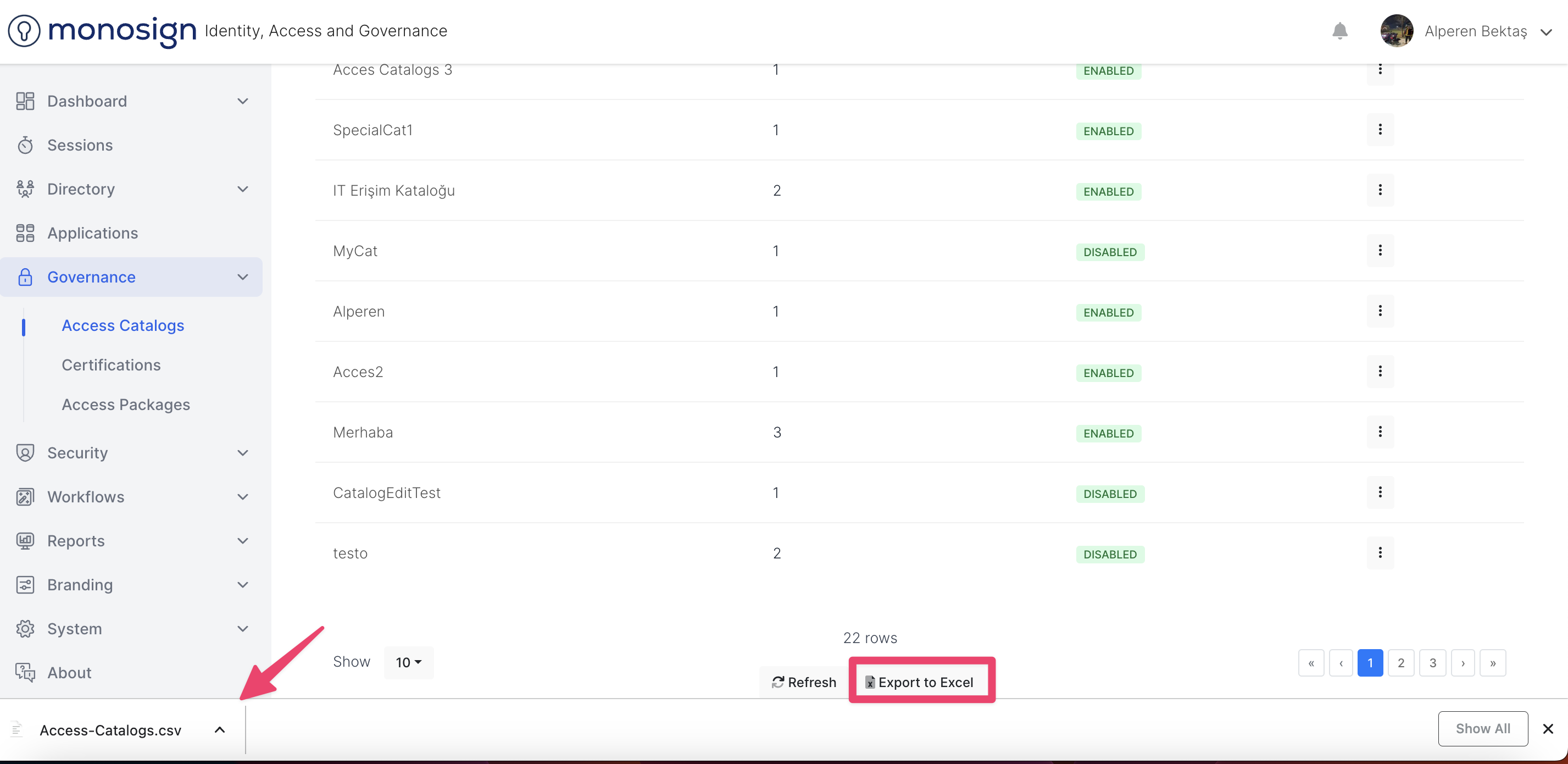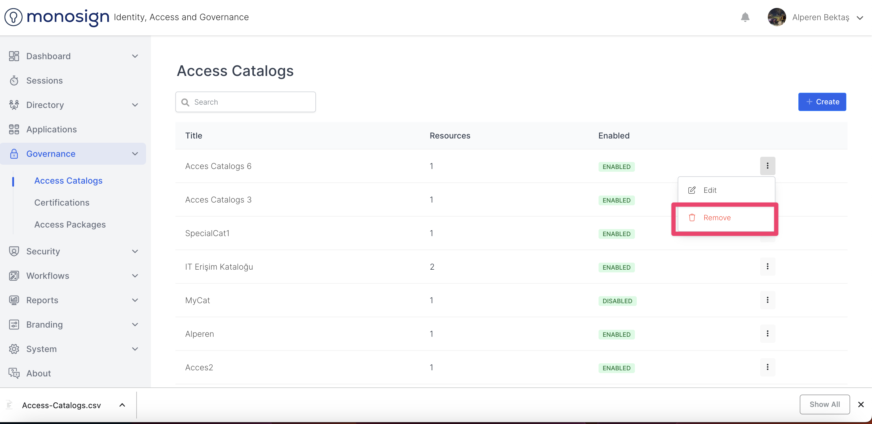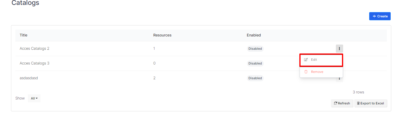 In order to edit the Access catalogs in the system, you can use the "edit" button from the quick actions menu.