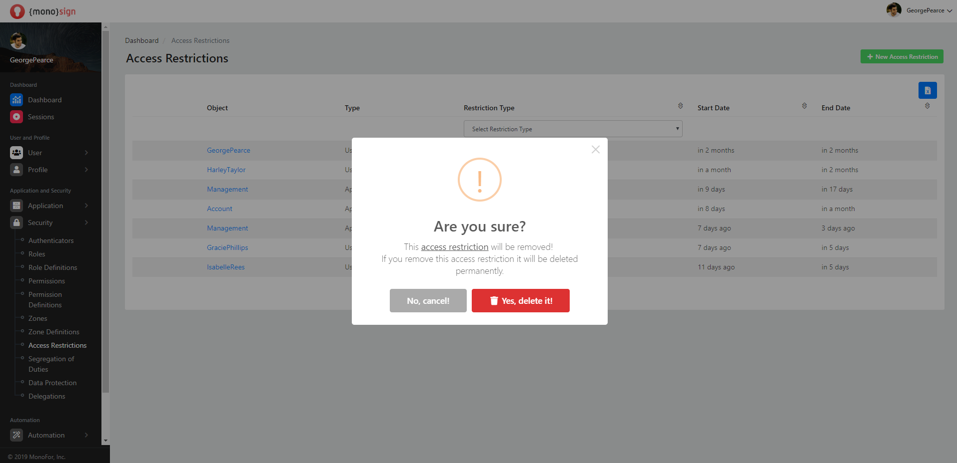 If you want to delete any access restriction, you can do it by clicking the red button on the left side of the object when you hover over the object from which you want to delete. When the button is clicked, "Are you sure?", "This access restriction will be remowed! If you remove this access restriction it will be deleted permanently .