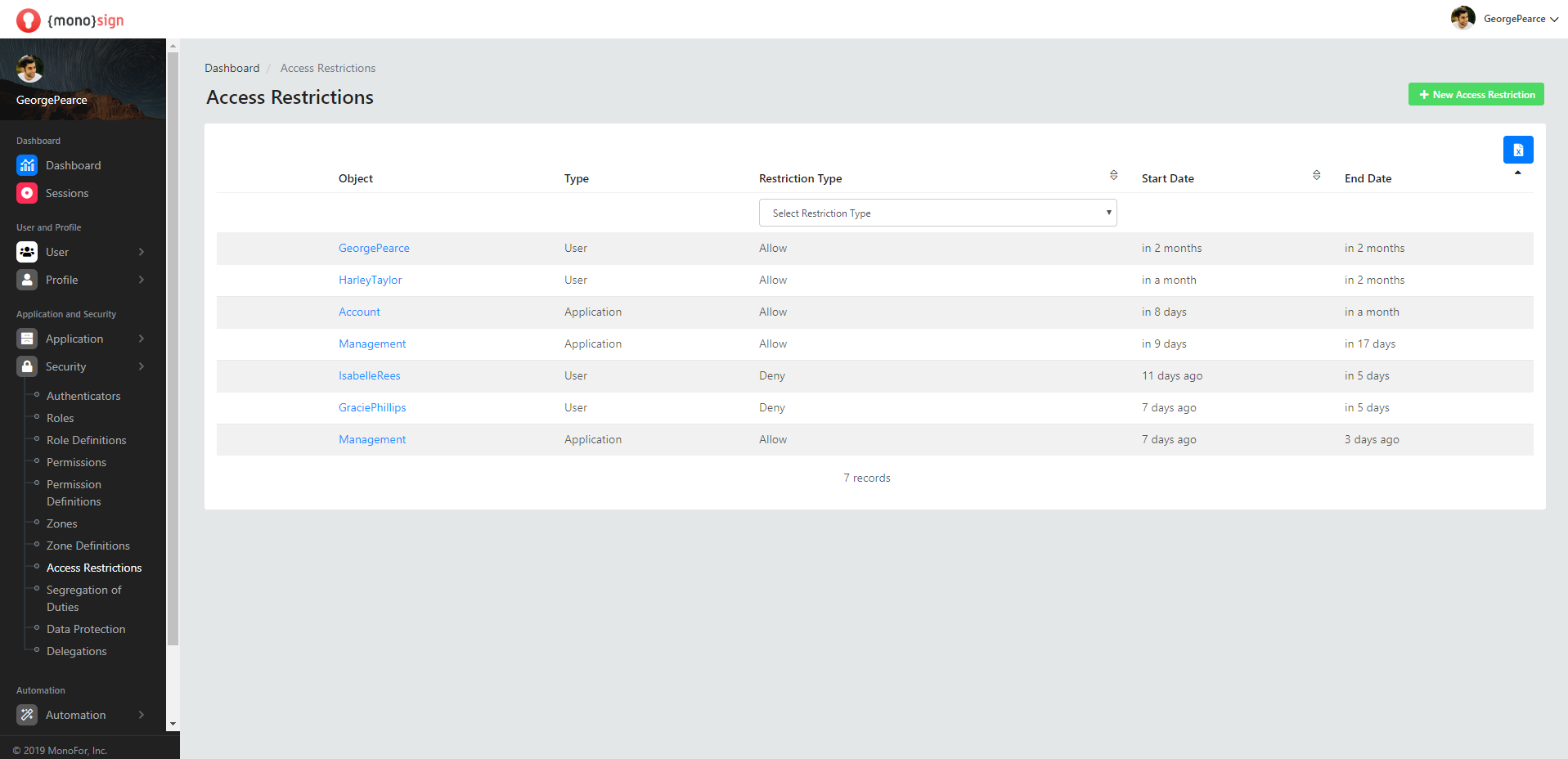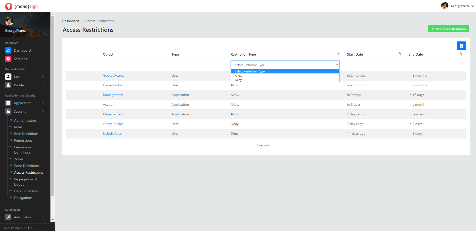 This is the page where access restrictions will be added to objects assigned to all object types/types defined on the system. Access restrictions page,