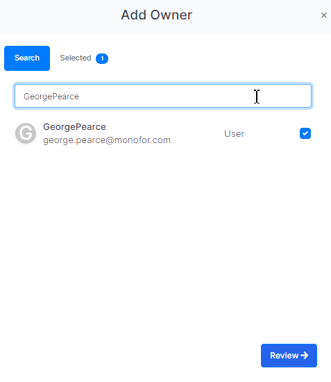 You can use the search feature to add a new owner to the catalog and add a catalog owner to the access package from users on the system.