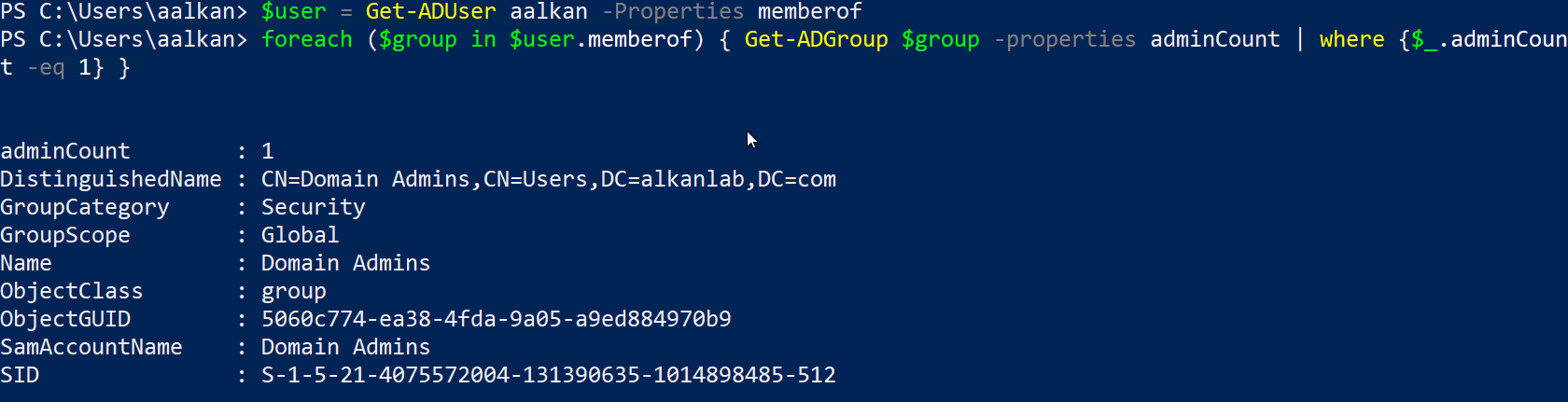 foreach ($group in $user.memberof) { Get-ADGroup $group -properties adminCount | where {$_.adminCount -eq 1} }