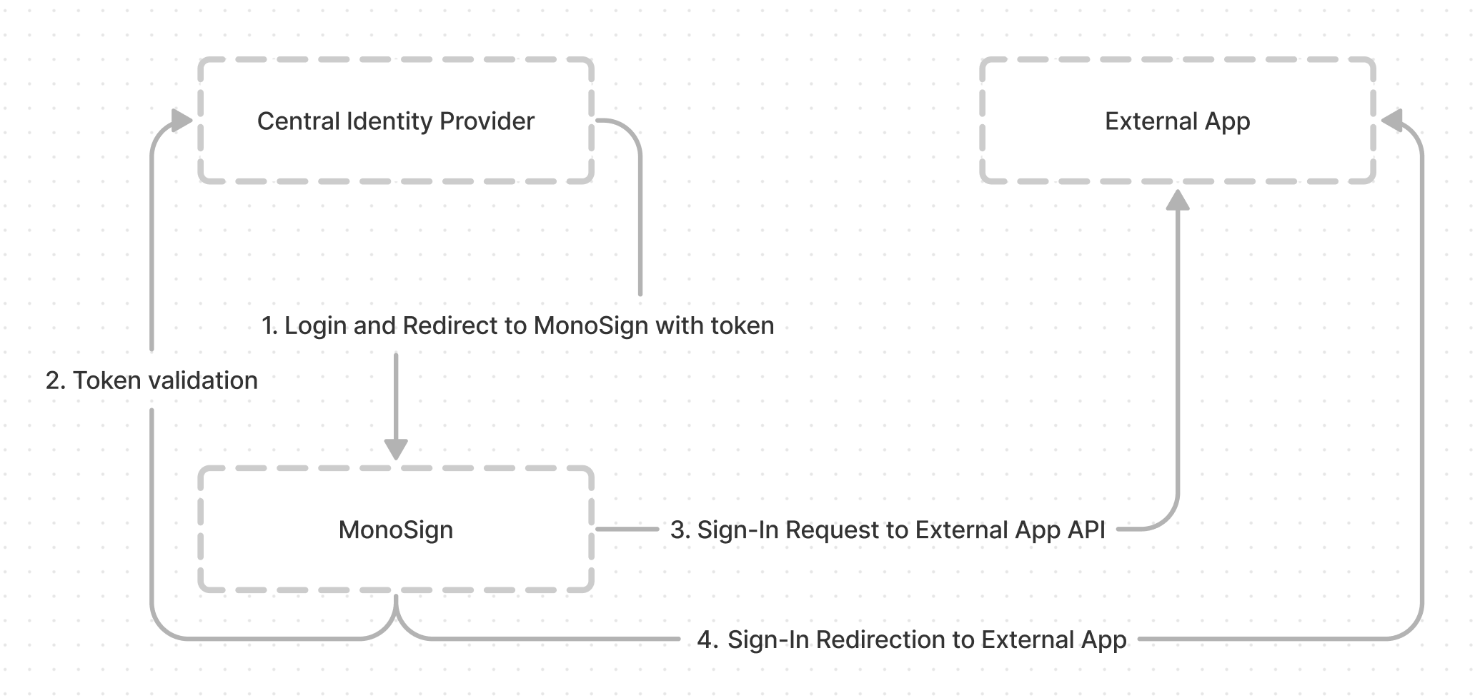 User Logins to Central Identity Provider and redirects the request to MonoSign with a token / ticket belongs to Central Identity Provider.