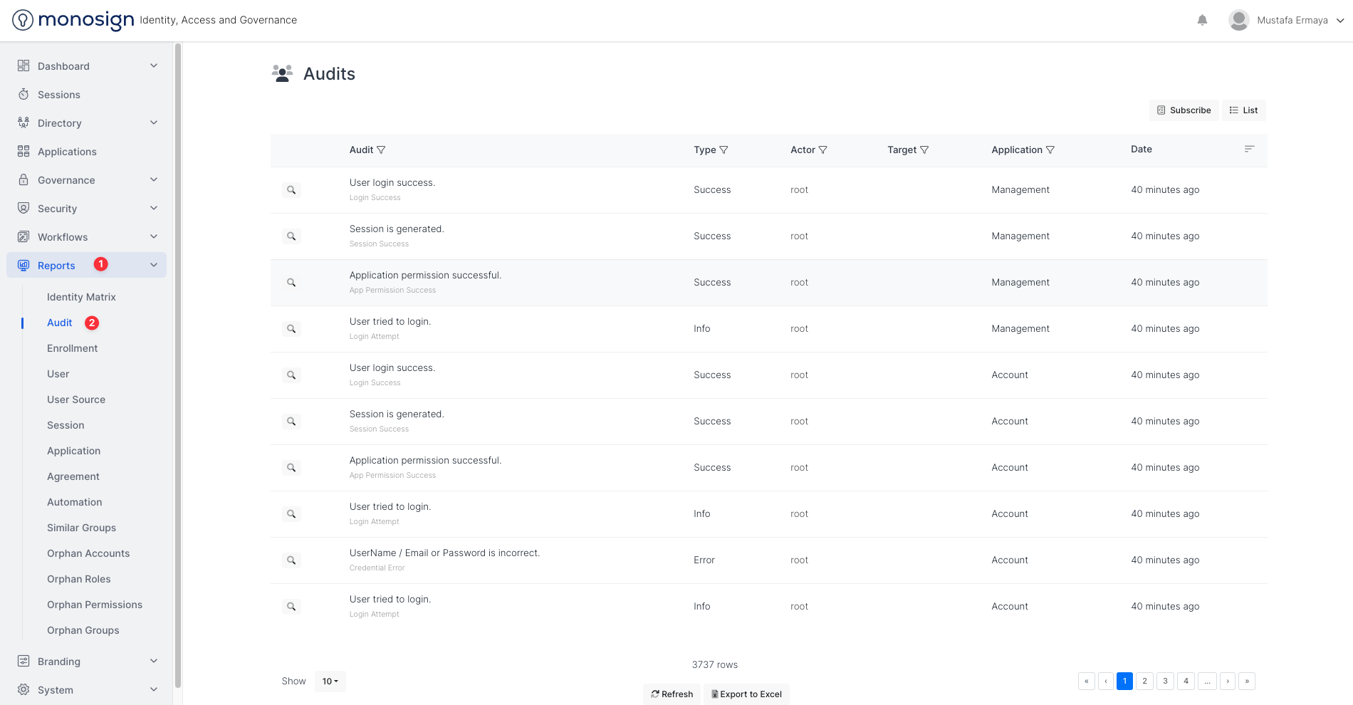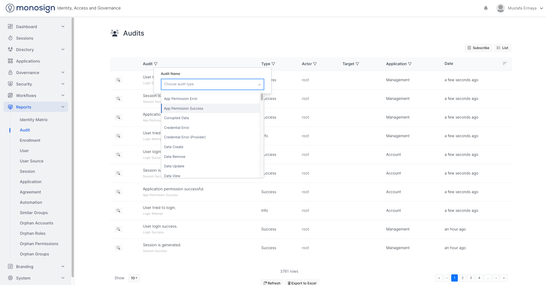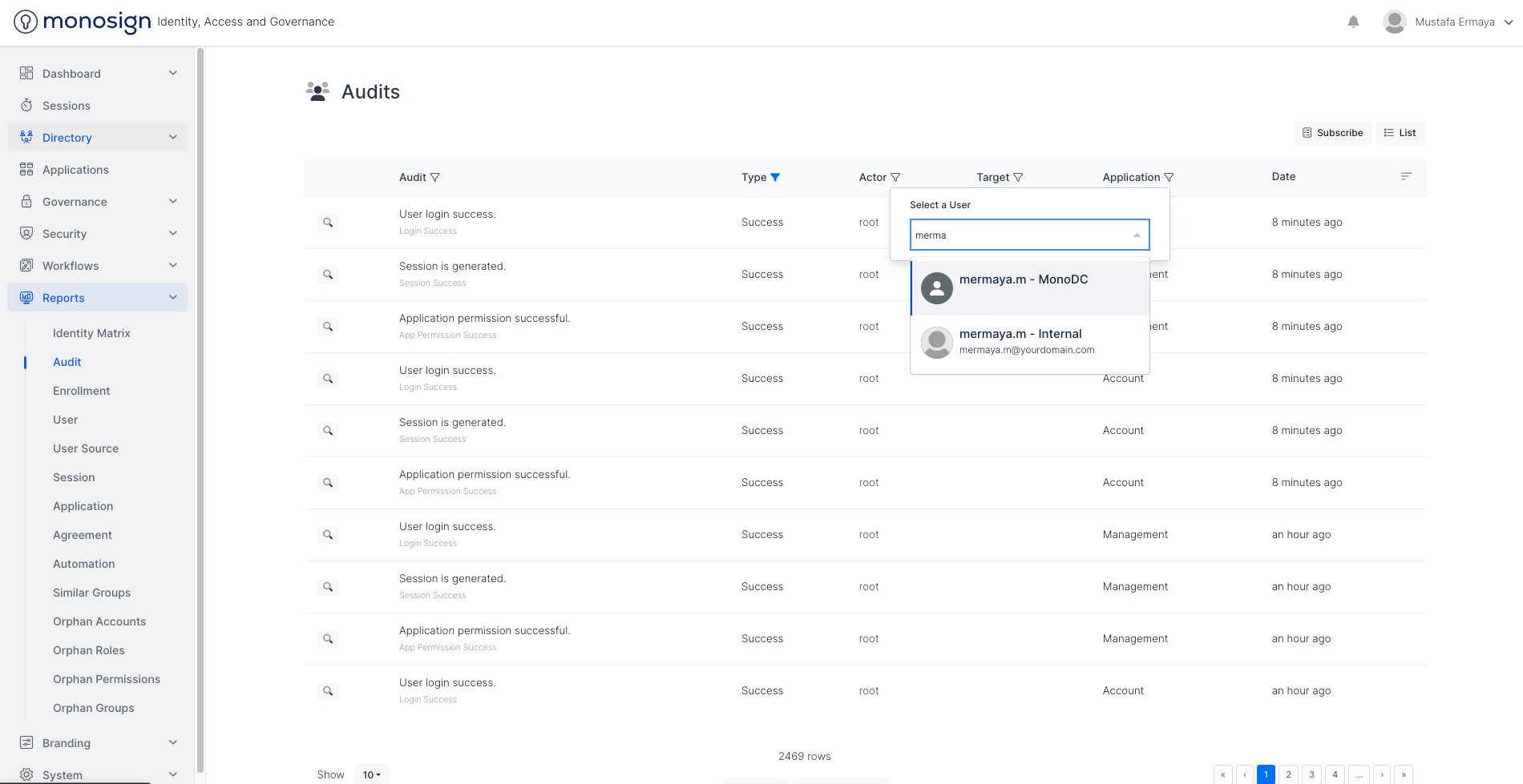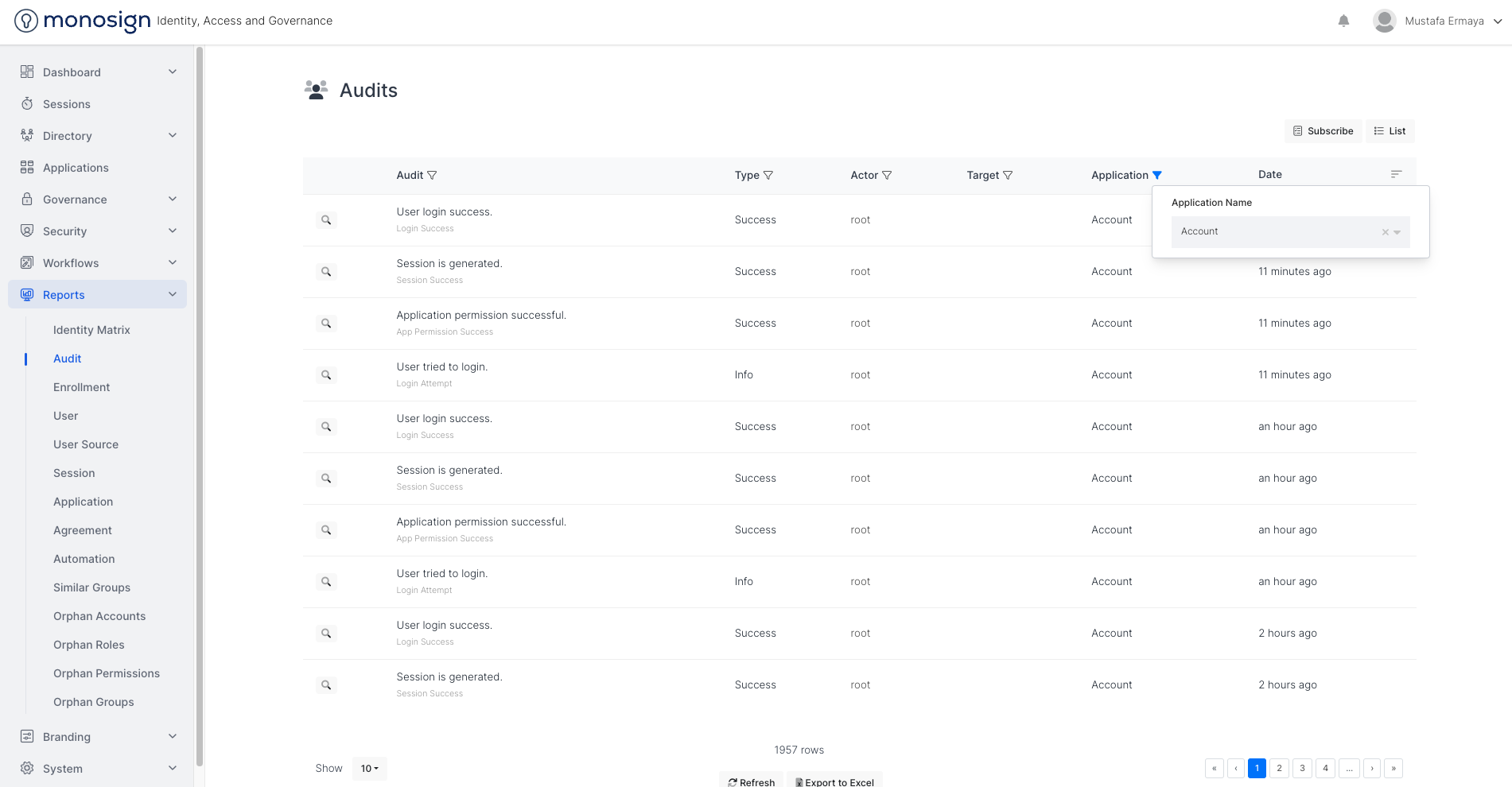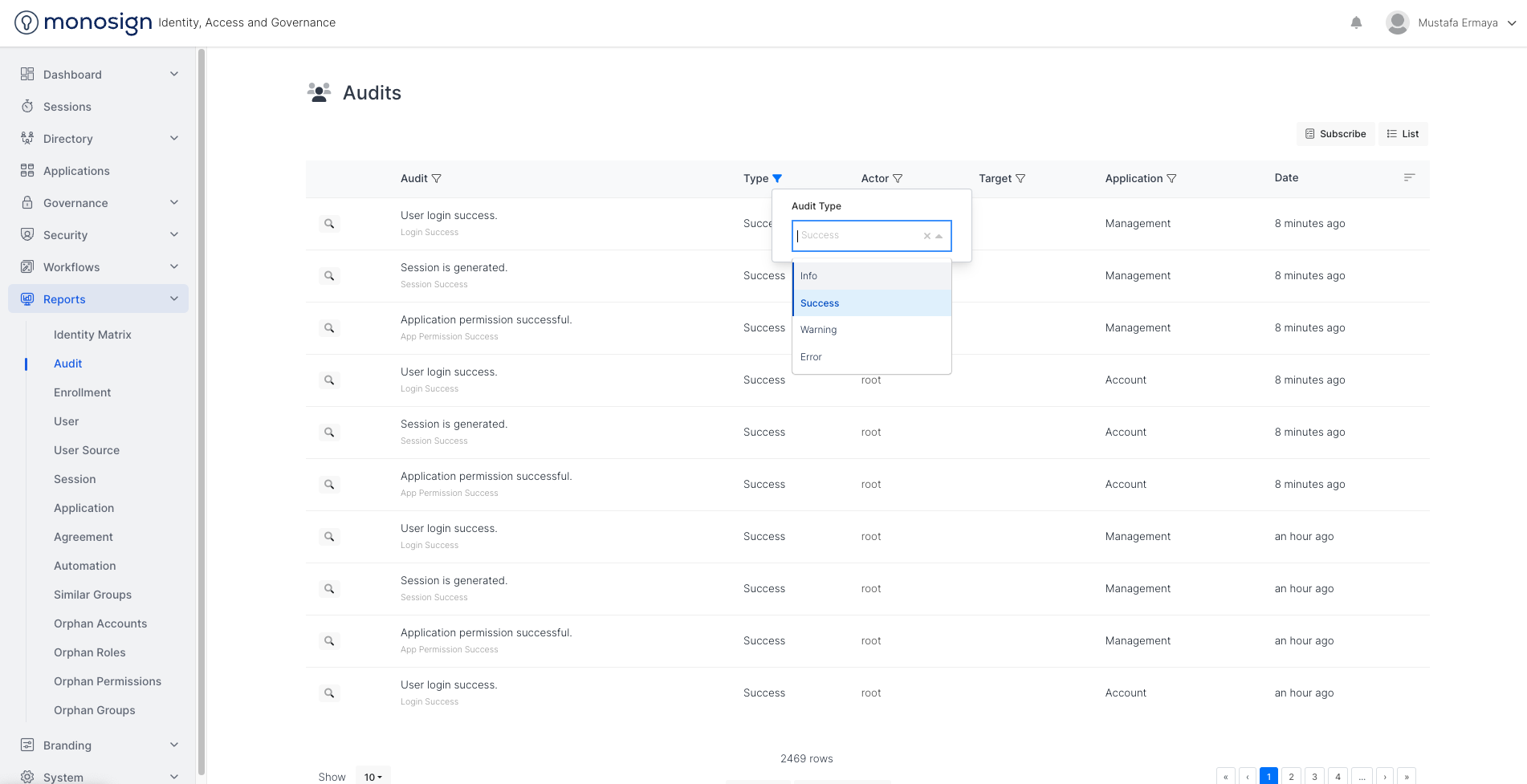 Application | Application of the audit. For example: Let’s assume Login Success audit definition wants to be filtered for which user is logged into which Application successfully. Admin user should filter by Application as shown. ![]() Audit Application |