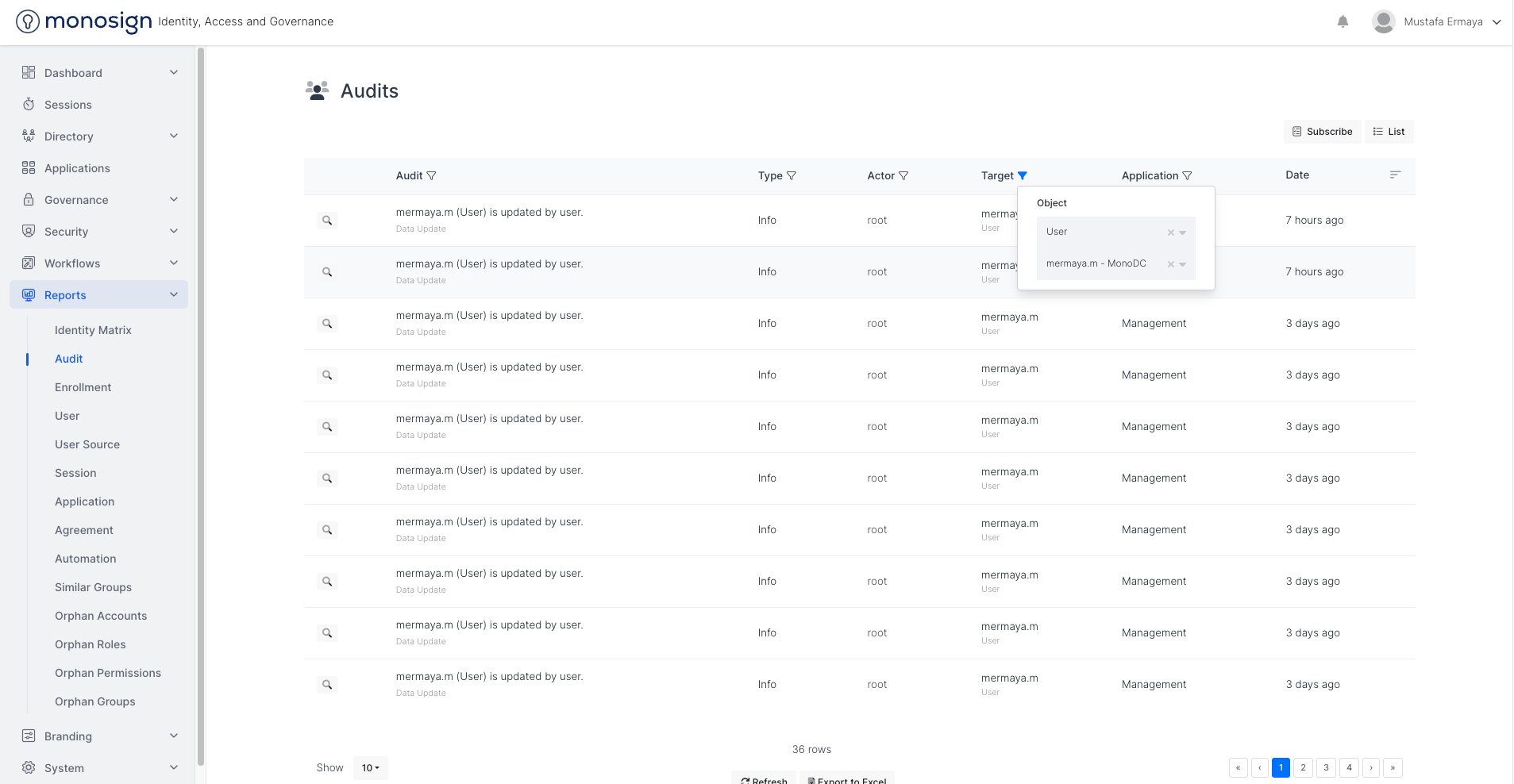 Actor | Actor of the audit. For example: Let’s assume Password Change audit definition wants to be filtered for user named “mermaya.m“. Admin user should filter by Actor as shown. ![]() Audit Actor |