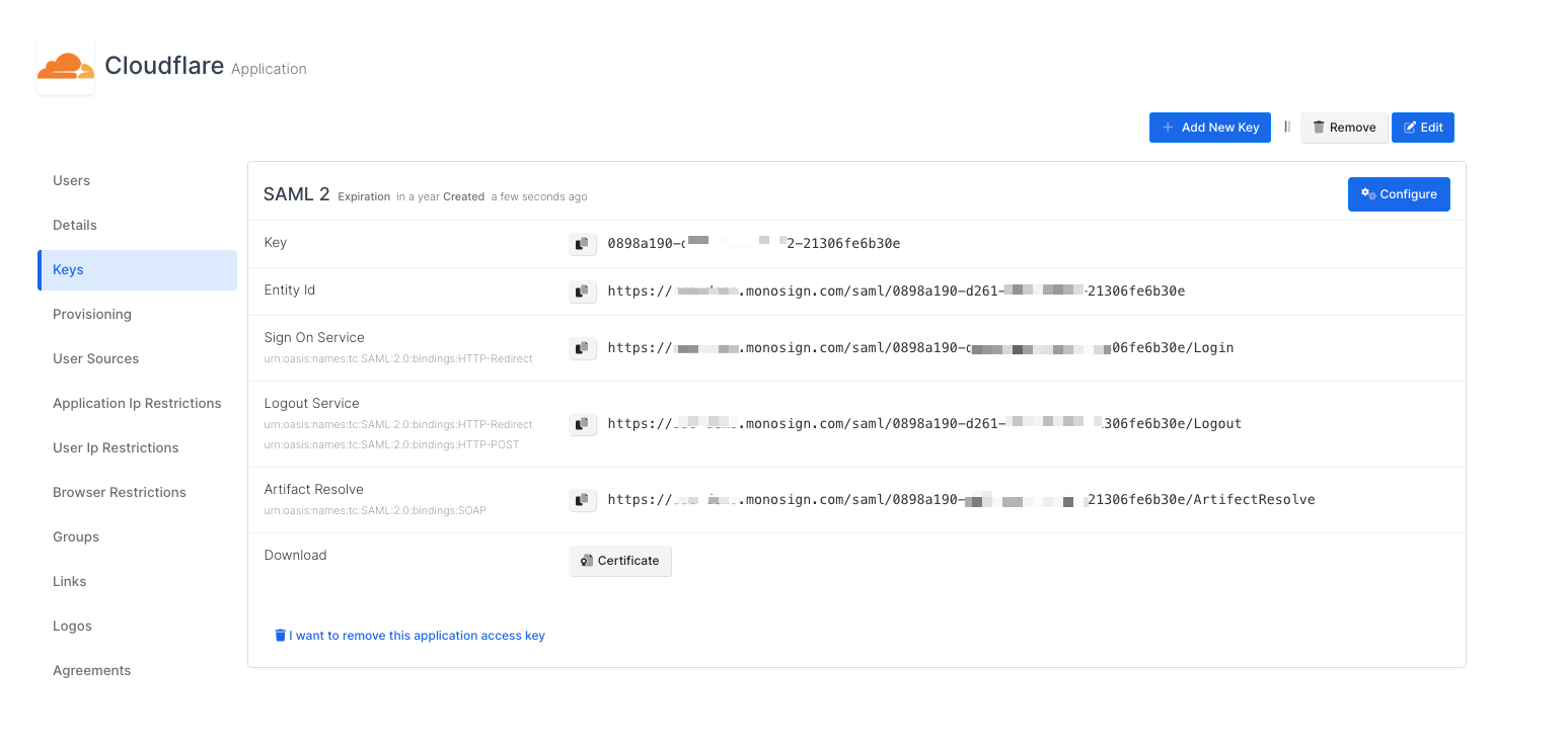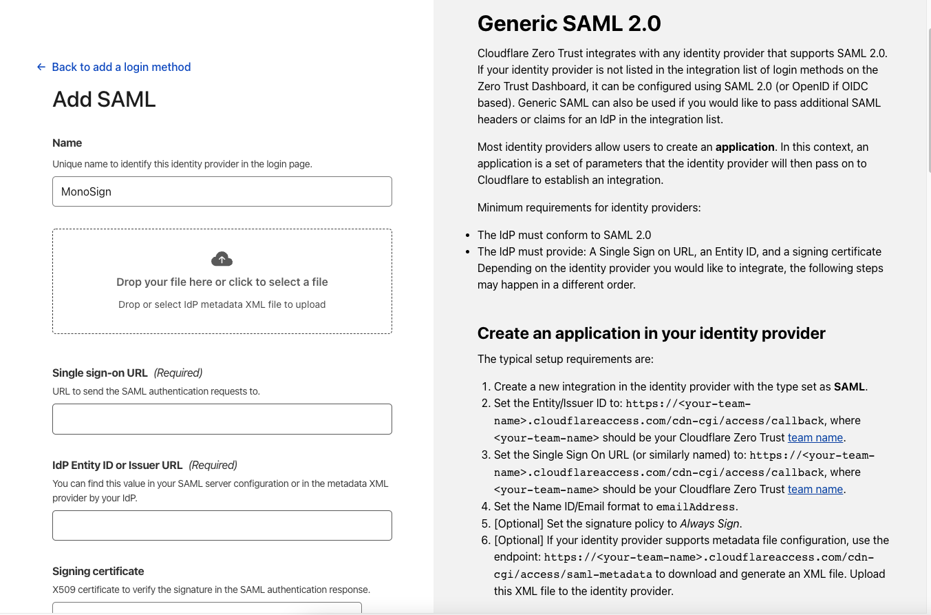 For now, we will stop here on the Cloudflare side and create a MonoSign application and related SAML key by using the information provided by Cloudflare.