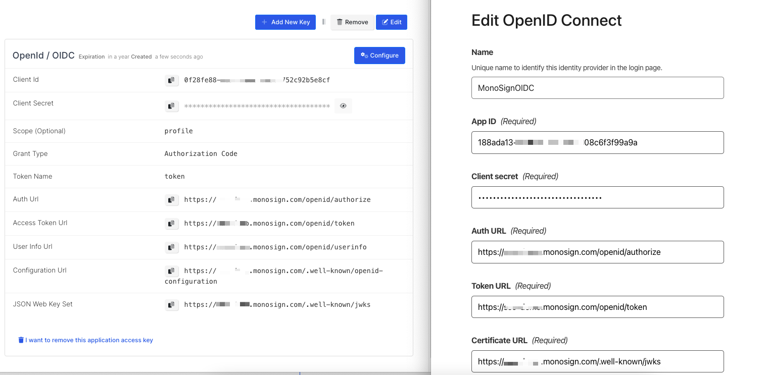 Create your application on MonoSign and configure your access policy. Once you create, click Keys and Add New Key to create a OpenId access key.