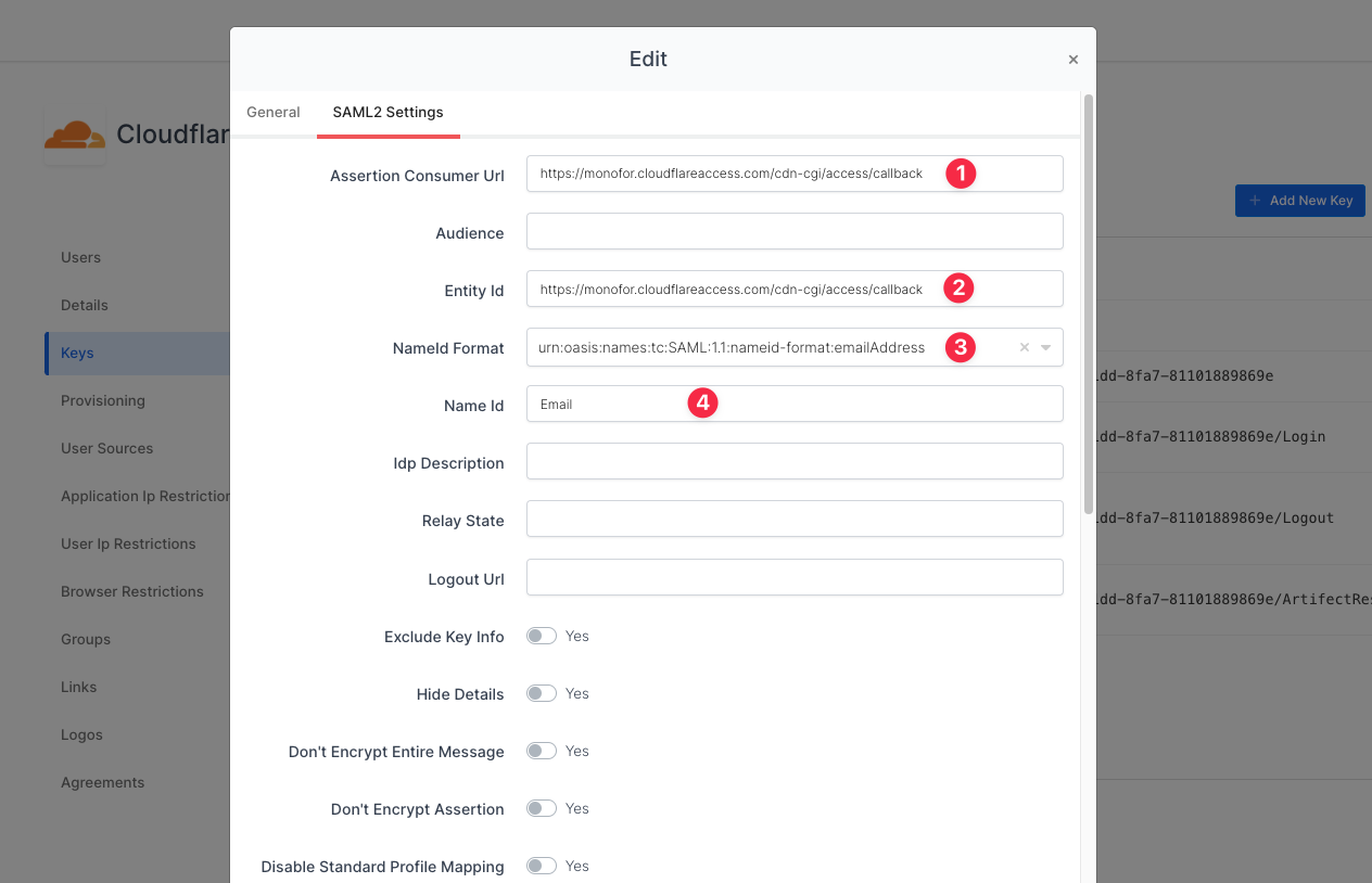 In the opened modal, choose SAML as Key Type and switch to SAML2 Settings. Fill in the necessary fields according to the information provided by Cloudflare. Correspondings of the fields are as below.