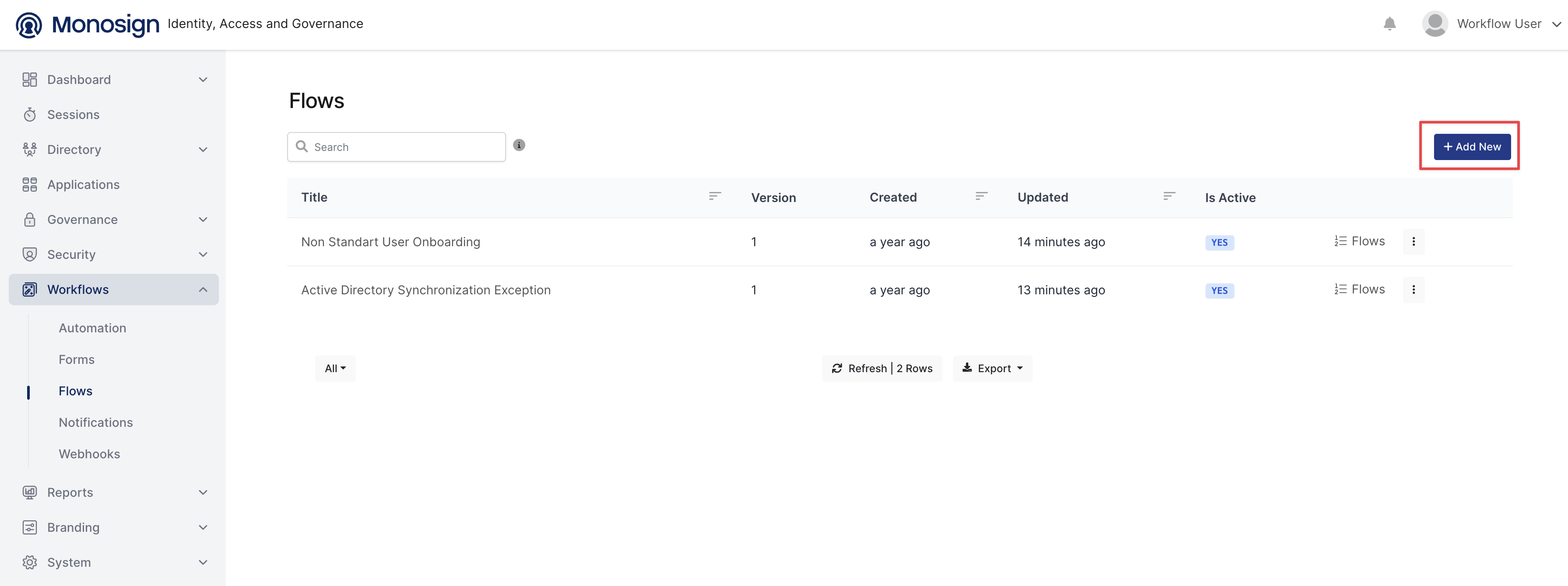 Permitted users are allowed to create Flow by clicking “Add New“ button on the Flows list page.