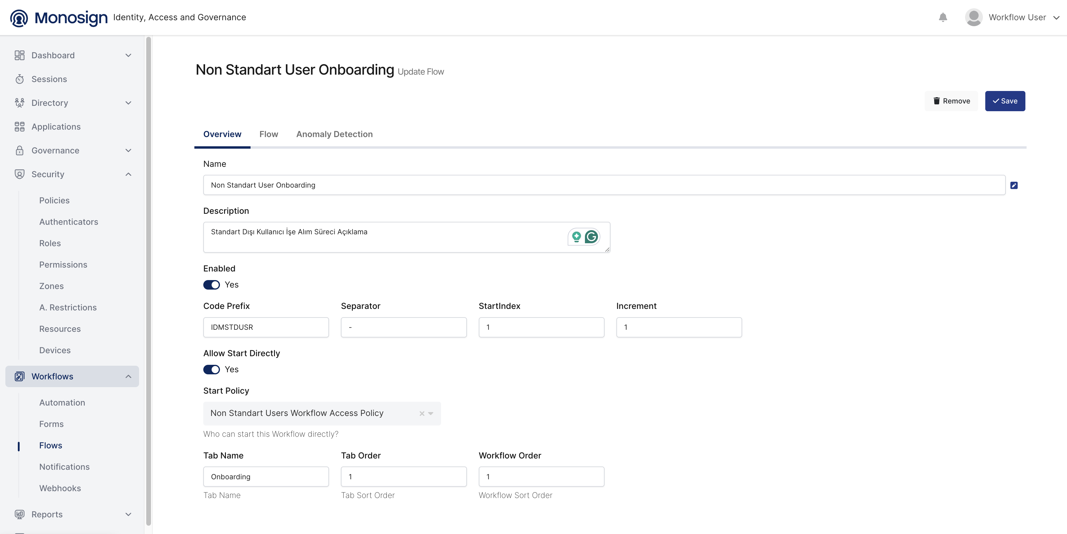 The Flow section is where you design and configure the actual workflow steps. In this area, you define how the workflow operates from start to finish. In Monosign, flow typically includes: