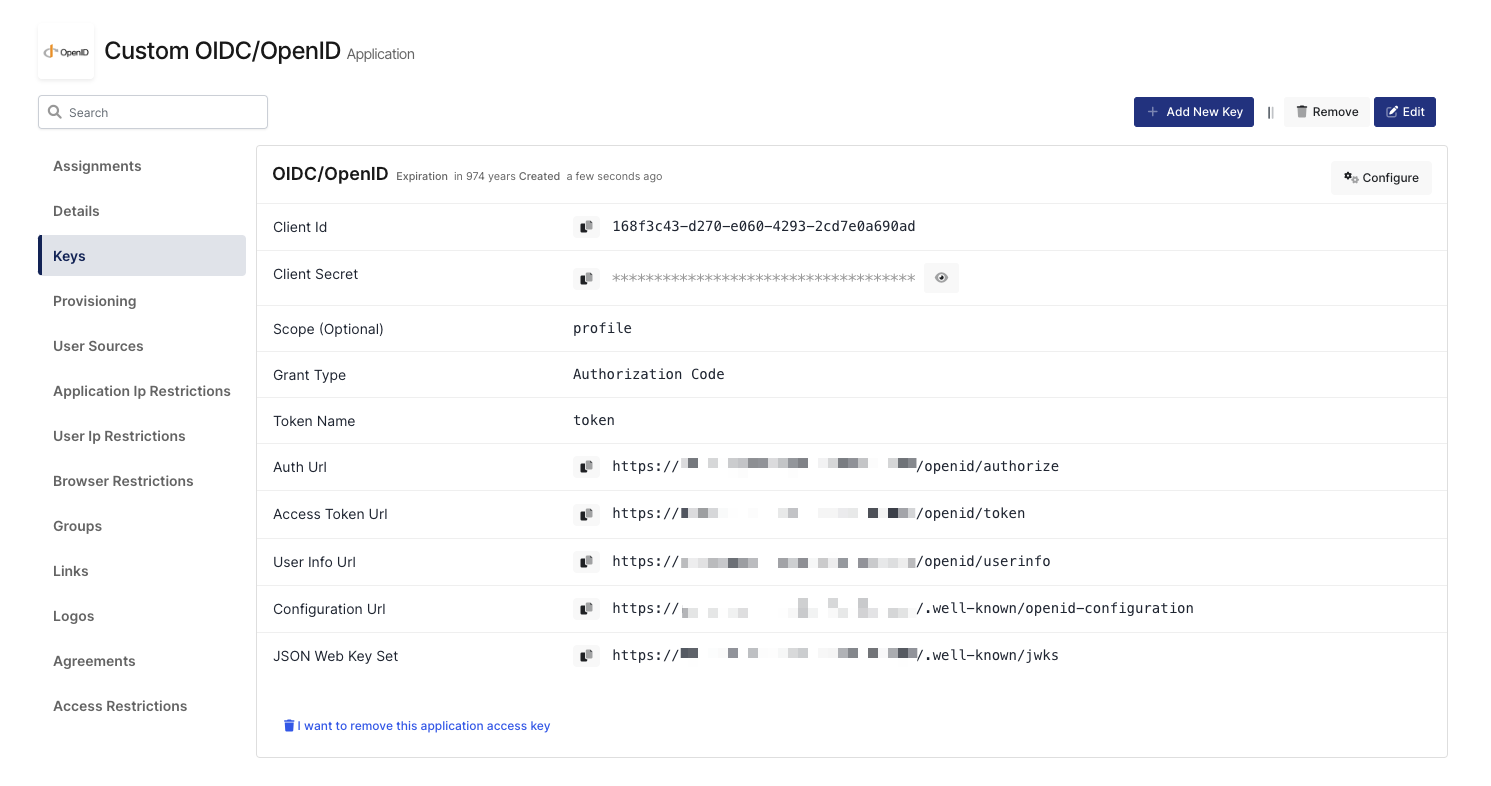 Create an application on Monosign and configure your access policy. Once you create, click “Keys” and add a new Access Key for OIDC/OpenID Key for access.