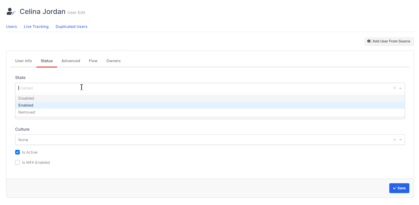 Status the resource status of the user is selected from the section. Its status in the source is followed from the state section.