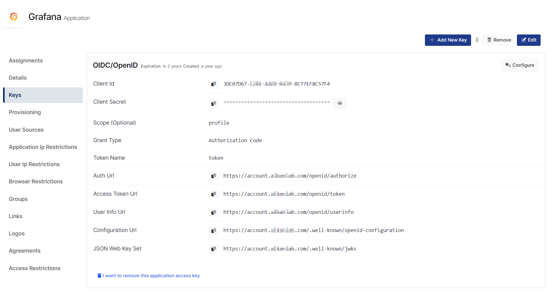Create application on Monosign and configure your access policy. Once you create, click “Keys” and add a new Access Key for OIDC/OpenID Key for access.