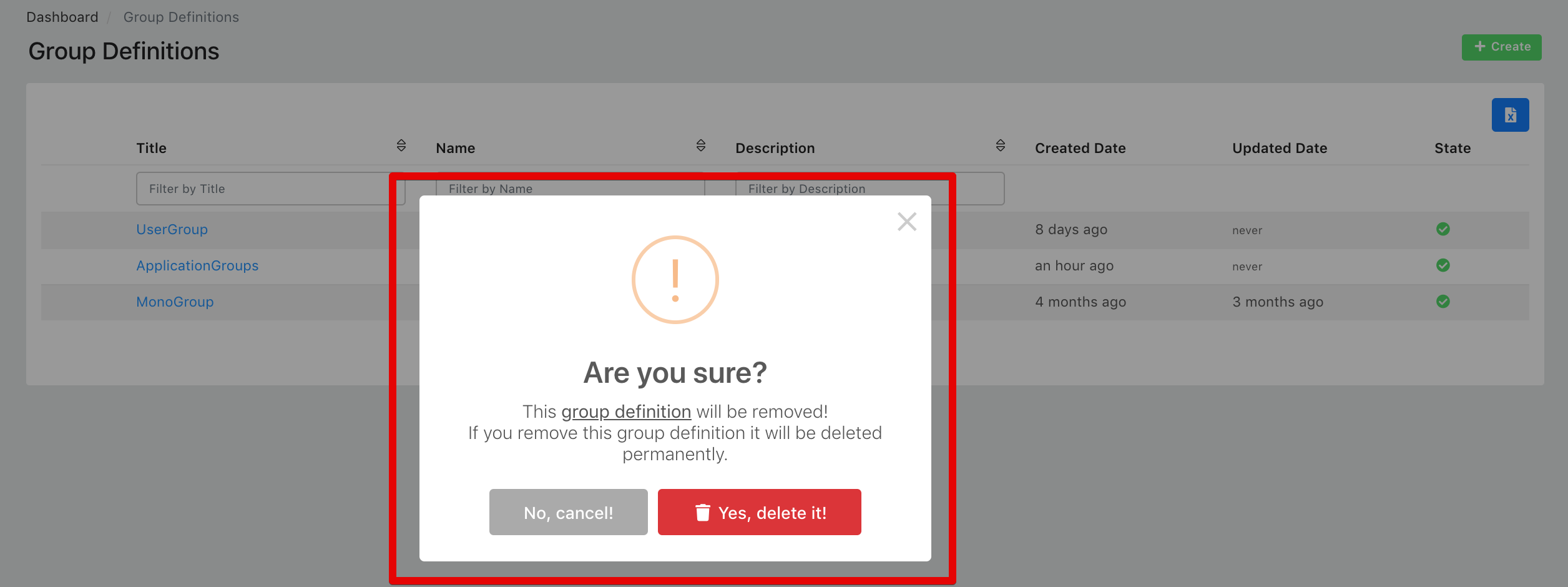 Group definitions are deleted from this tab. When you click the Remove button, you will be prompted to delete the page. If you confirm, the group definition will be deleted. However, if there is an object that the group is assigned to, you must first unassign these objects to the group.