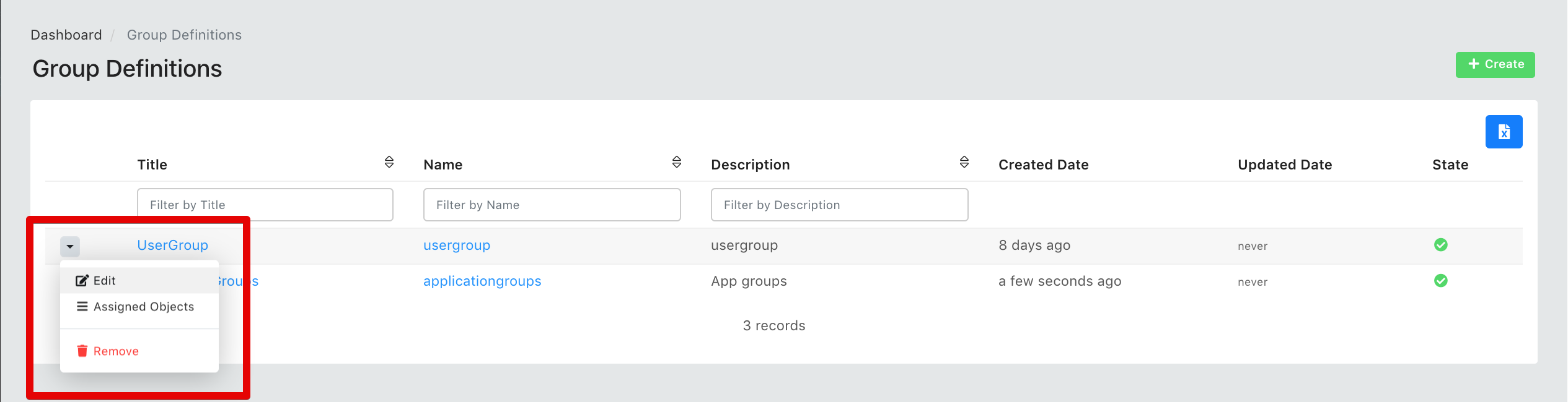 You can edit the group, view the objects that the group is assigned to, and delete the group from the quick actions menu on the left side of each group definition in the table (which becomes active when the group definition is hovered over).