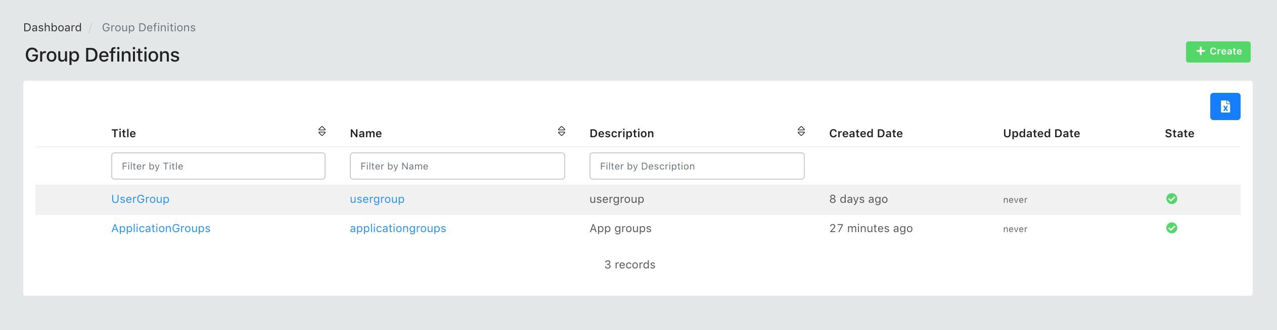 Before a group can be assigned to an object, the group must be defined from this page. Defined groups are listed on this page.