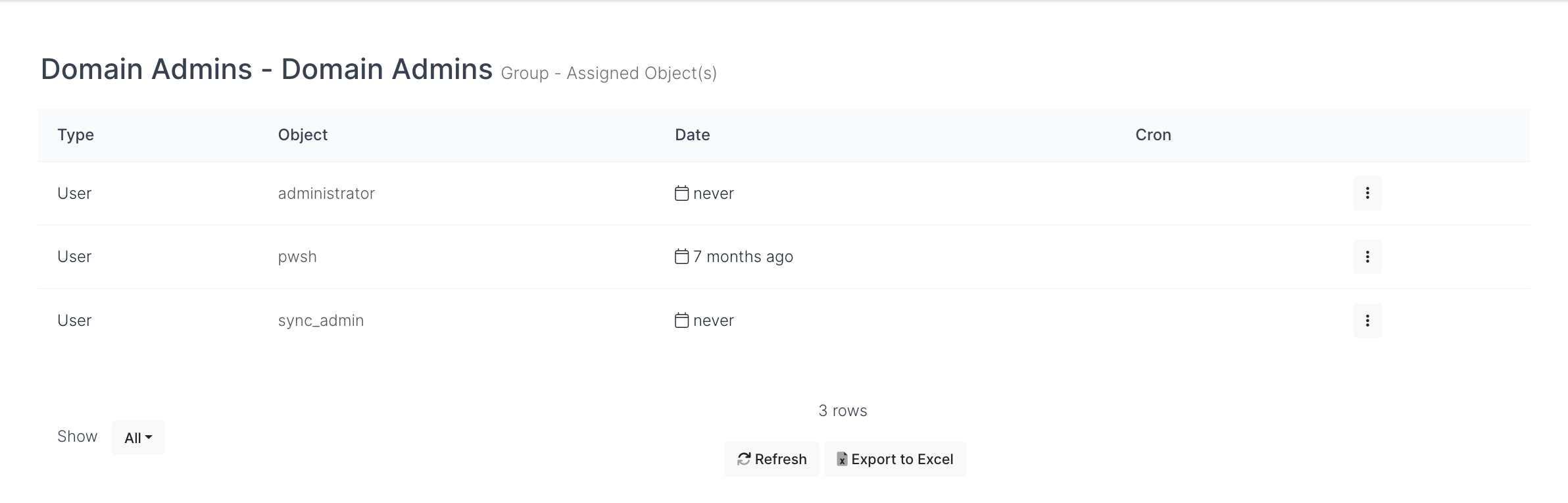 The Assigned objects table to open contains the following information;