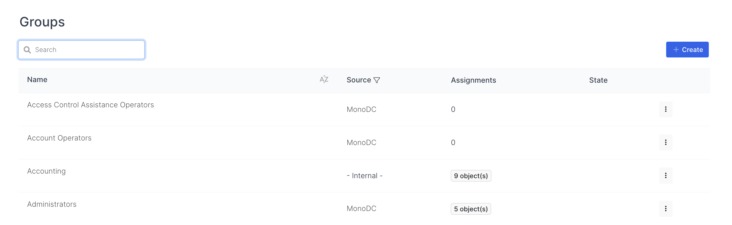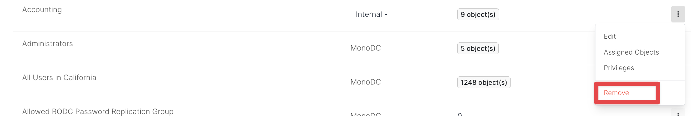 Actions that can be taken for the relevant group can be accessed by clicking the down arrow icon that appears while hovering over that group. The only action that can be taken for assigned groups is to unassign the relevant object.