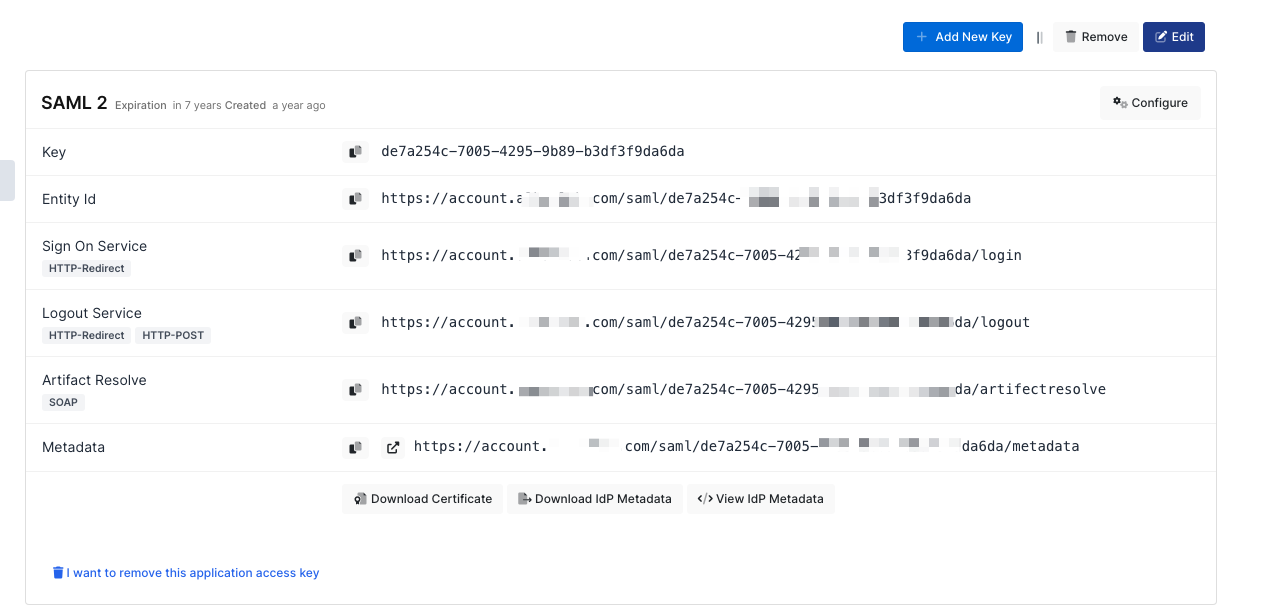 Create your application on Monosign and configure your access policy. Once you create, click “Keys” and add a new Access Key for SAML 2.0 Key for access.