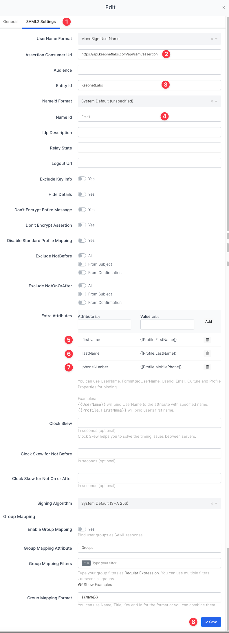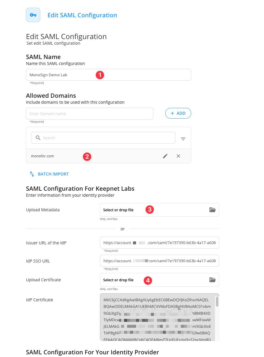 For now, we will stop here on the Keepnet Labs side and create a MonoSign application and related SAML key by using the information provided by Keepnet Labs.