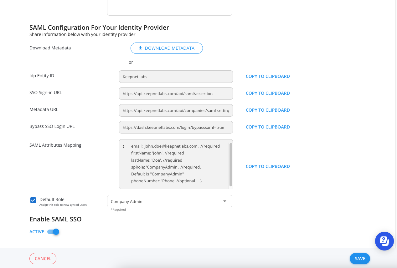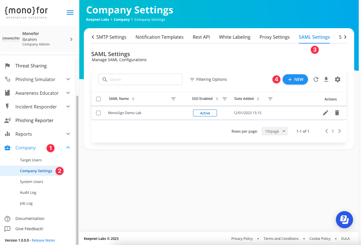 In order to configure the SAML key on MonoSign for Keepnet Labs SSO, you need to have various information provided by Keepnet Labs. First, navigate to Company > Company Settings from the sidebar then go to SAML tab and click New button.