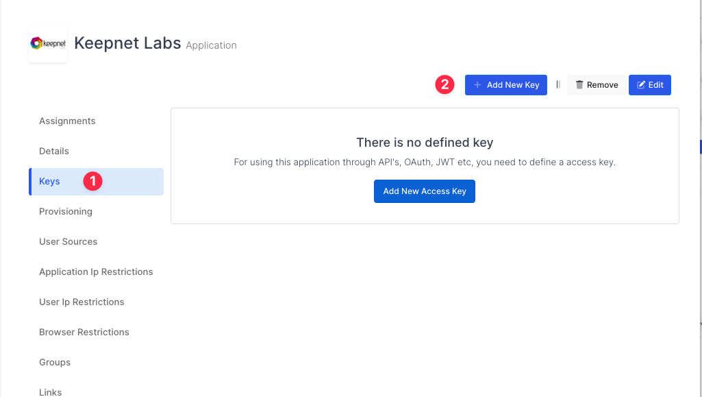Once you create, click Keys and Add New Key to create a SAML access key.