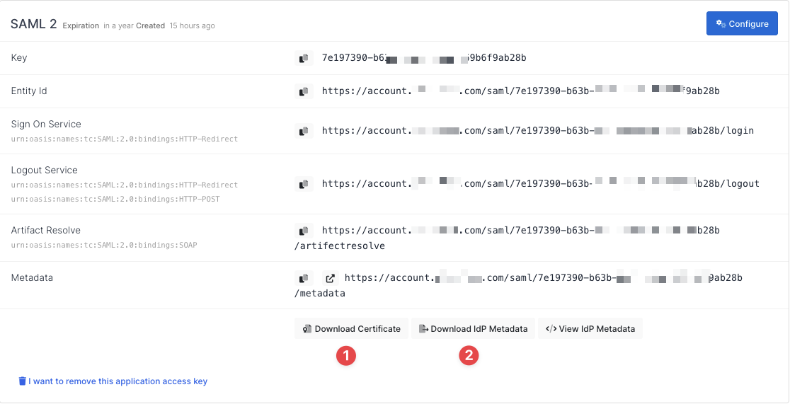 Click on the marked buttons to download Certificate and Metadata files.