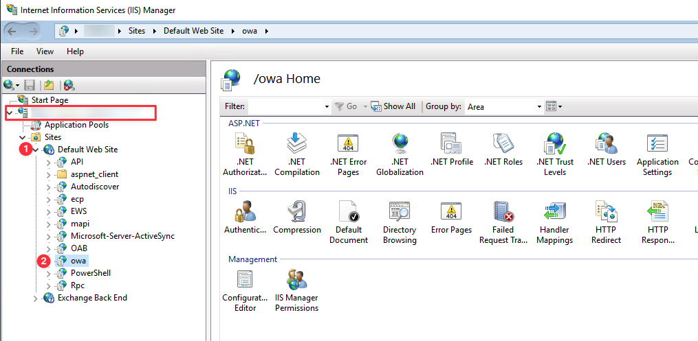 Connect your OWA server and open IIS (Run inetmgr.exe).