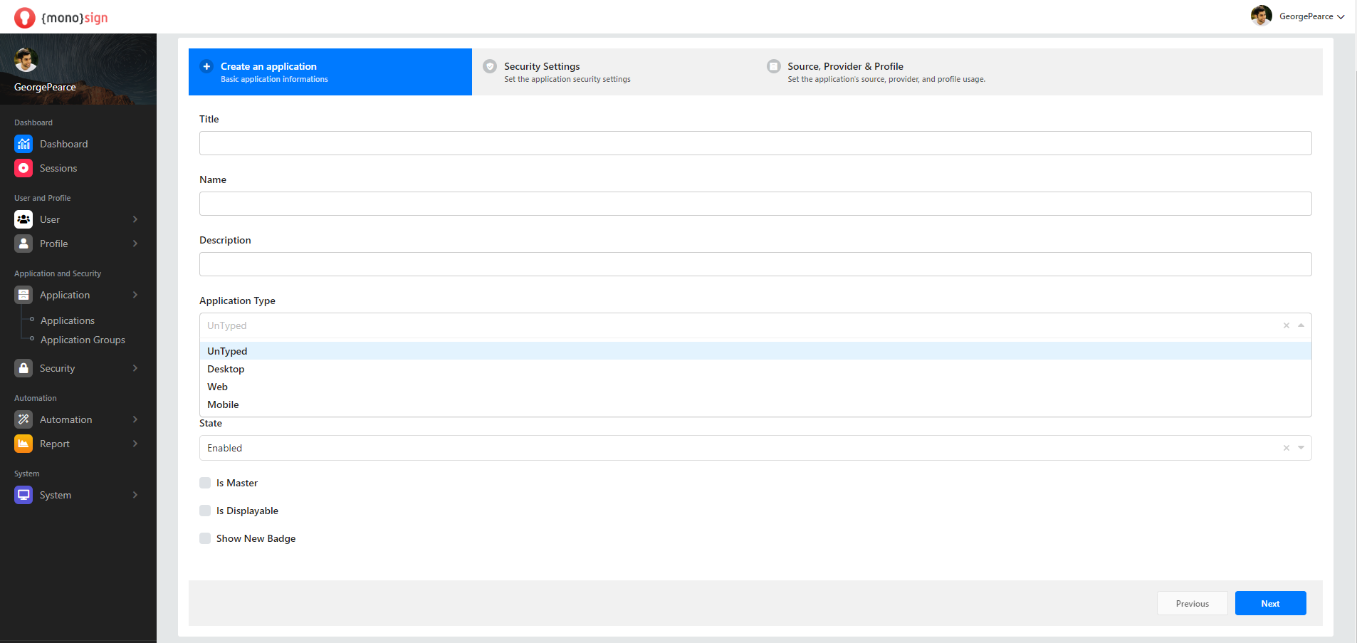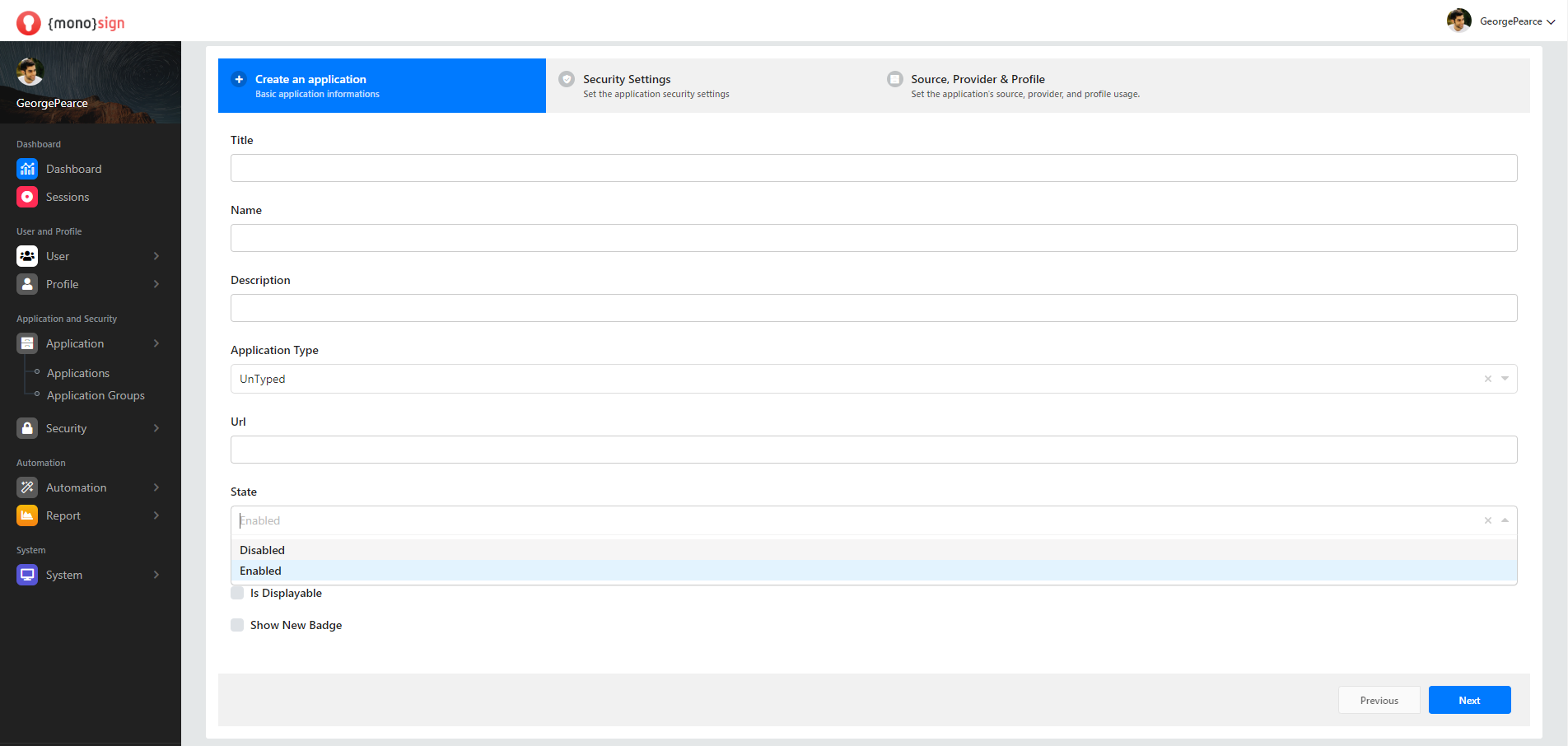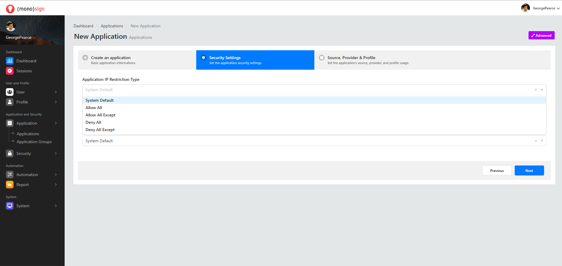 The next and previous buttons on the Add new application page allow you to switch back and forth between the Create an Application, Security Settings and Source, Provider & Profile sections.
