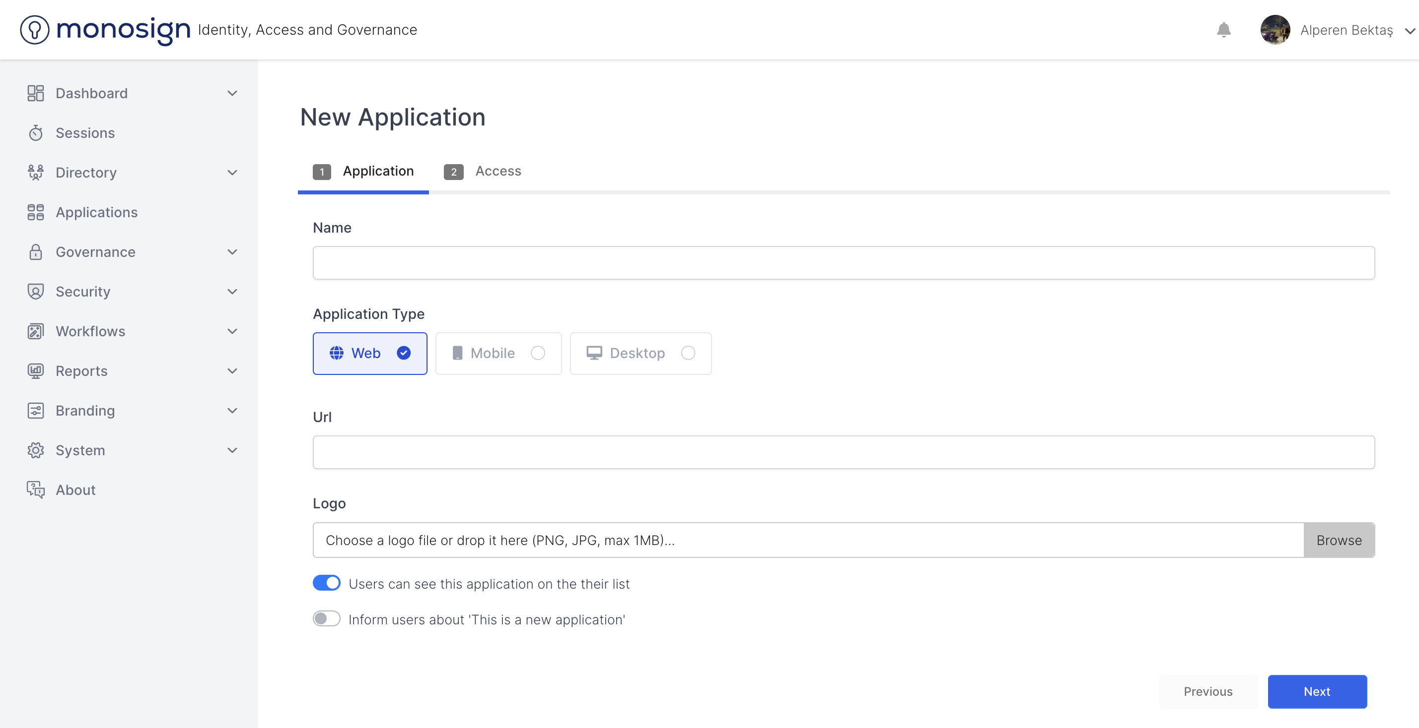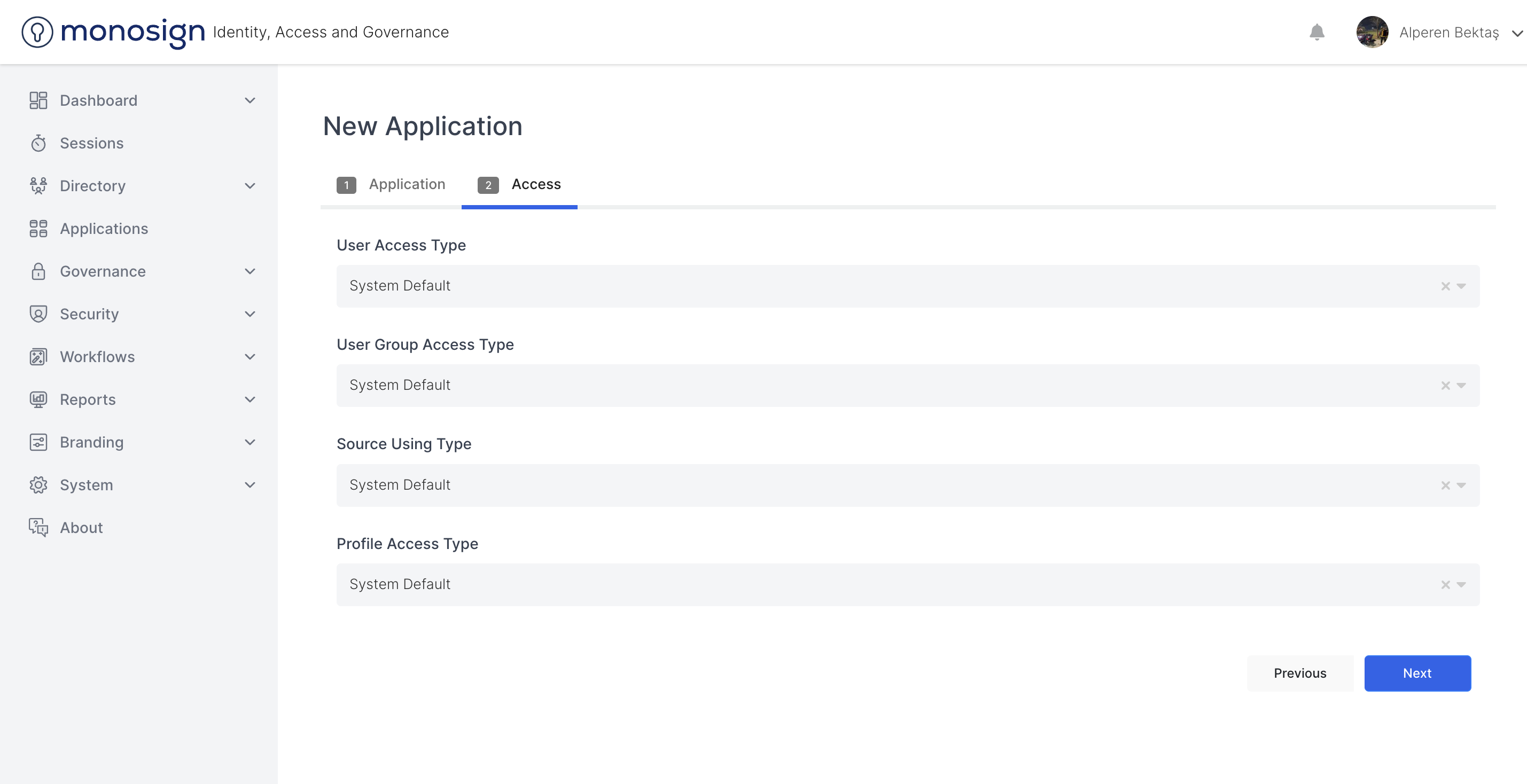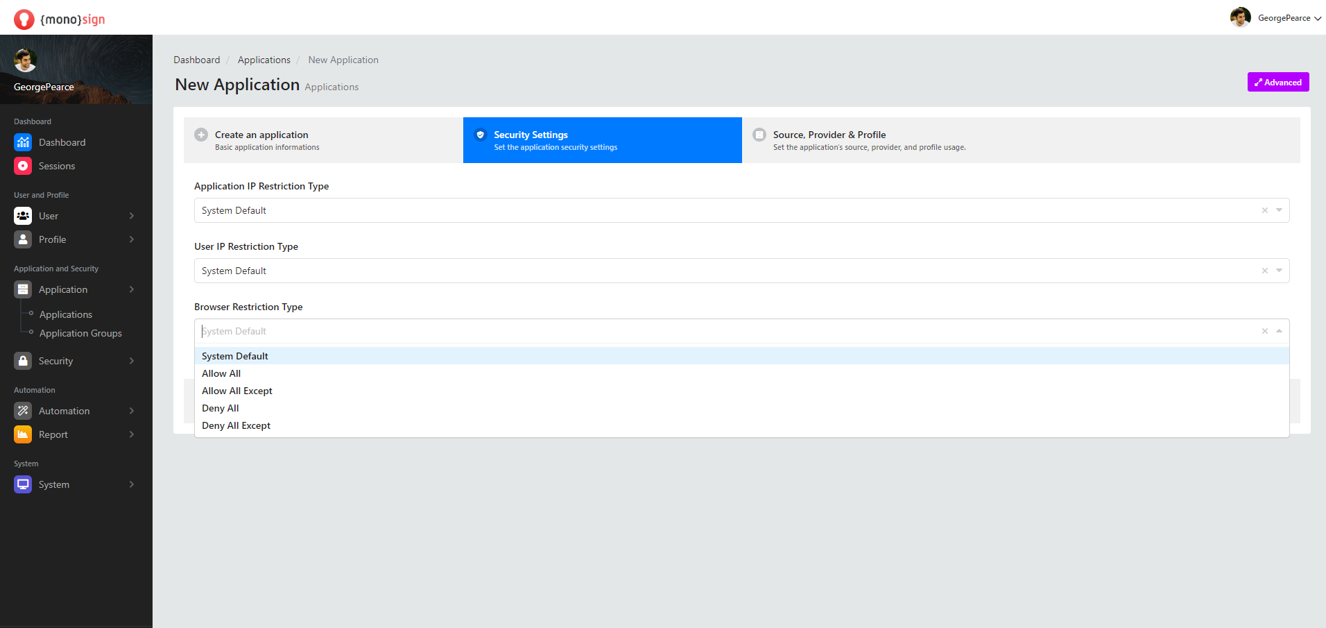 The next and previous buttons on the Add new application page allow you to switch back and forth between the Create an Application, Security Settings and Source, Provider & Profile sections.