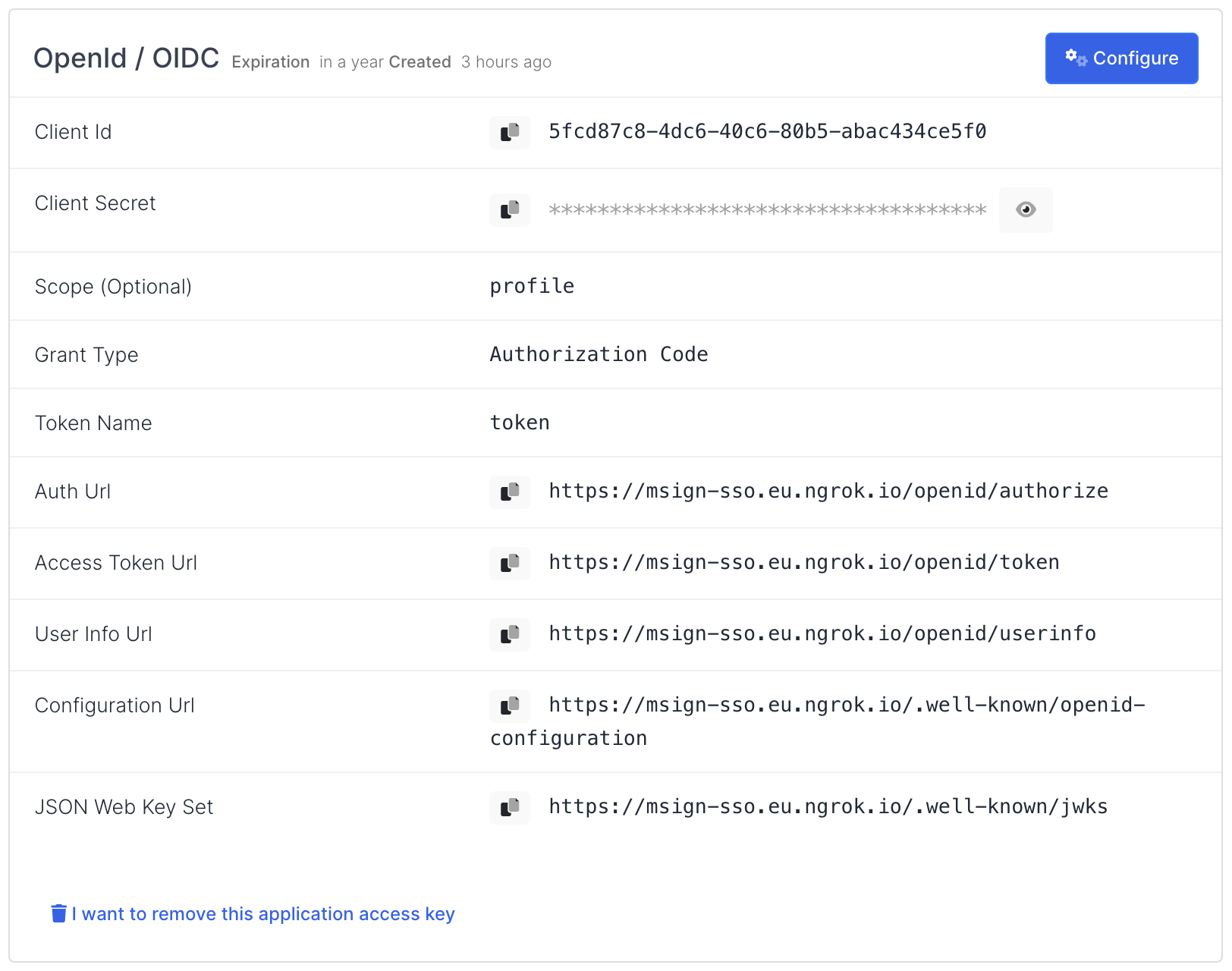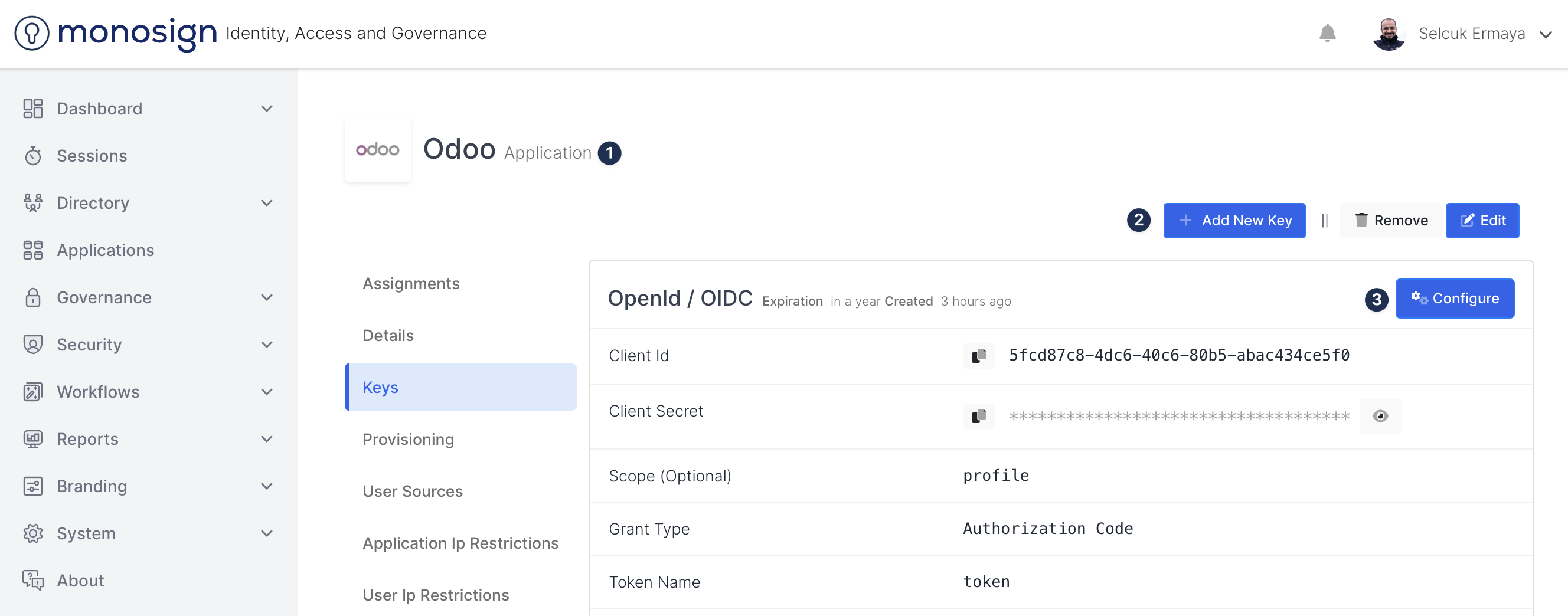 Create your application on MonoSign and configure your access policy. Once you create, click “Keys” and add a new Access Key for OpenId / OIDC Key for access.