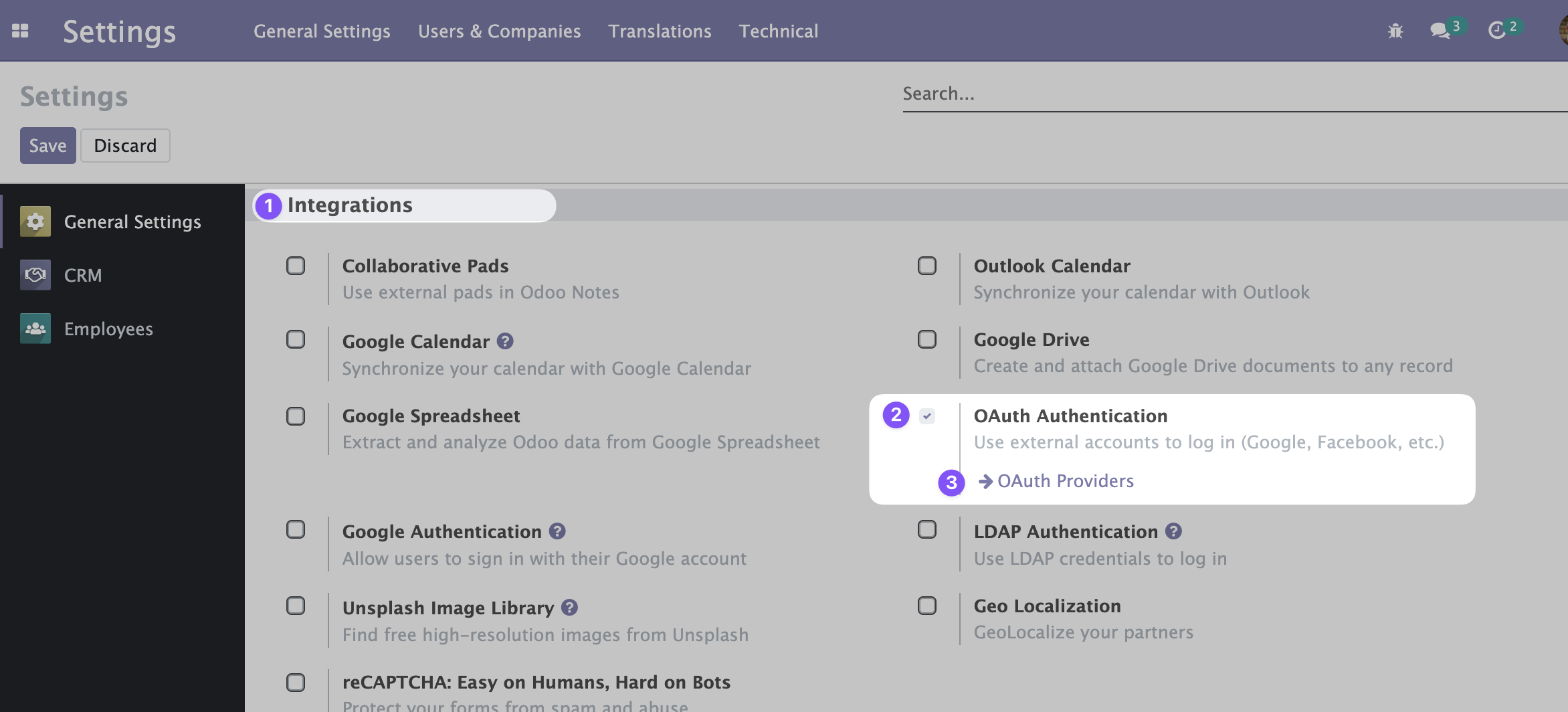 Scroll down to the Integrations, and enable the OAuth Authentication. Save settings. When you have done it, scroll down to the Integrations again and click OAuth Providers.