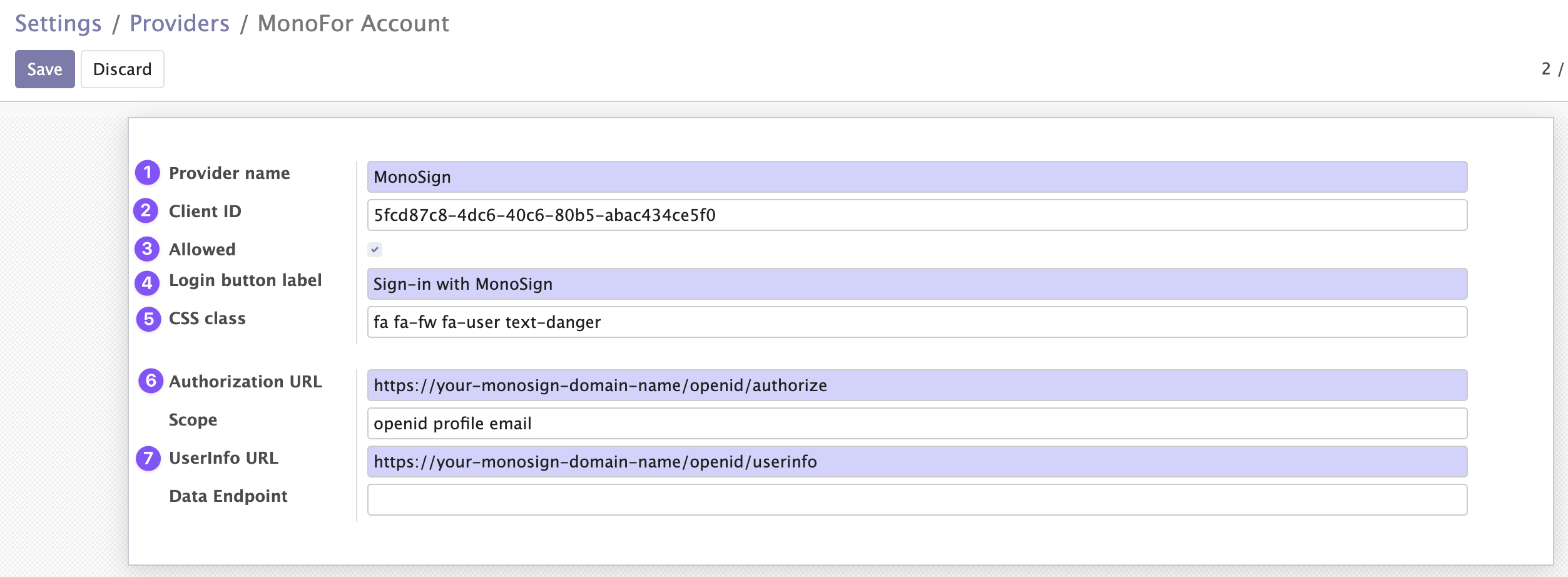 Fill out the form as follows and click Save. Do not forget to change it with your MonoSign Account domain.