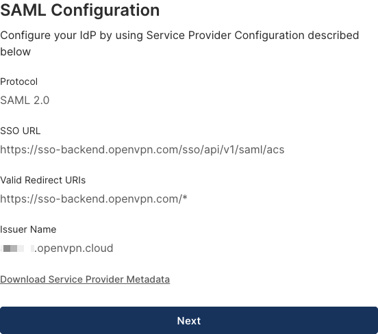 SAML option will be disabled by default since it is not configured. Click Configure button under the option. On the opening page, you will view OpenVPN SAML metadata.