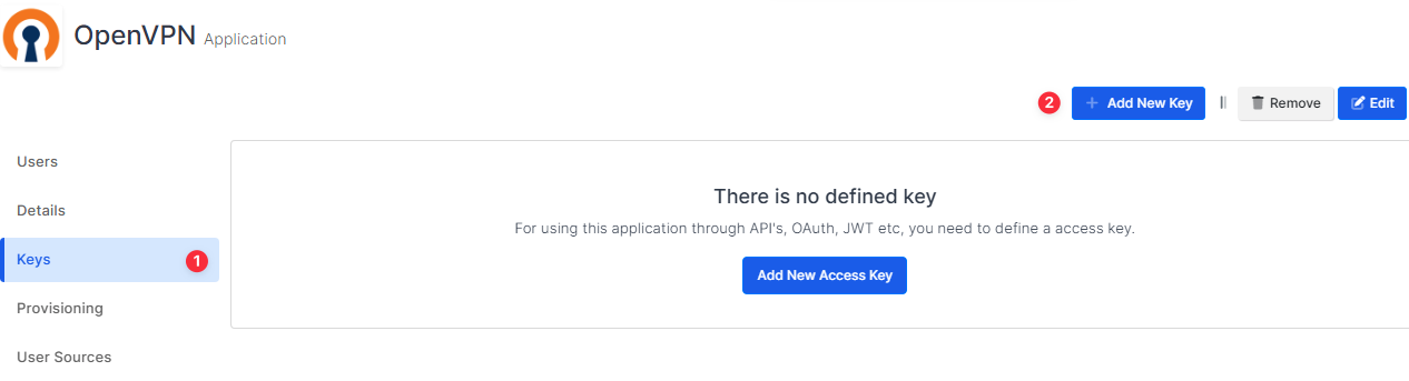 Create your application on MonoSign and configure your access policy. Once you create, click Keys and Add New Key to create a SAML access key.
