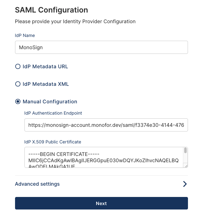 We are gonna move on to where we left off on the SAML Configuration page which is mentioned in the first chapter. Click Next and Choose Manual Configuration. Fill in the necessary fields according to the access key created on MonoSign. Correspondings of the fields are as below.