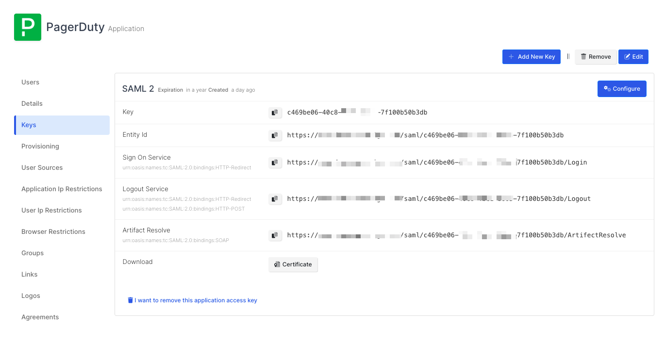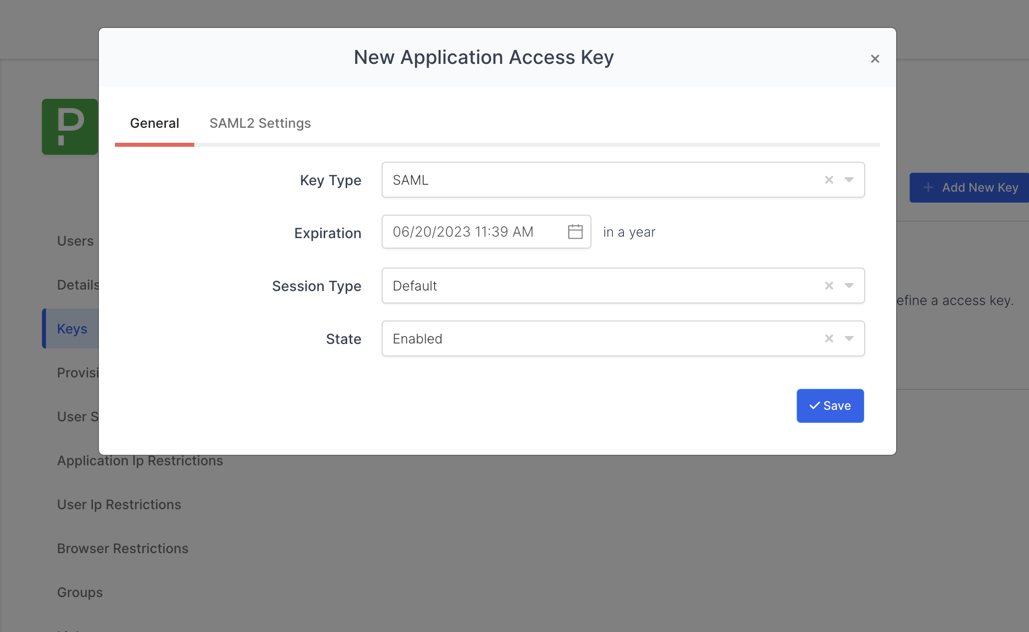 Once you created the application and navigated to the detail page, click Keys and Add New Key to create a SAML access key.