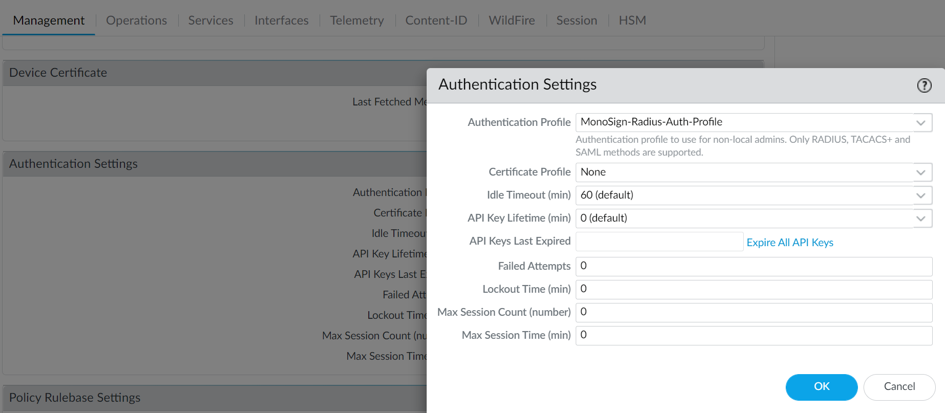 Go to Palo Alto admin web GUI and click Device → Setup → Management → Authentication Settings and choose the Radius profile created in the previous steps.