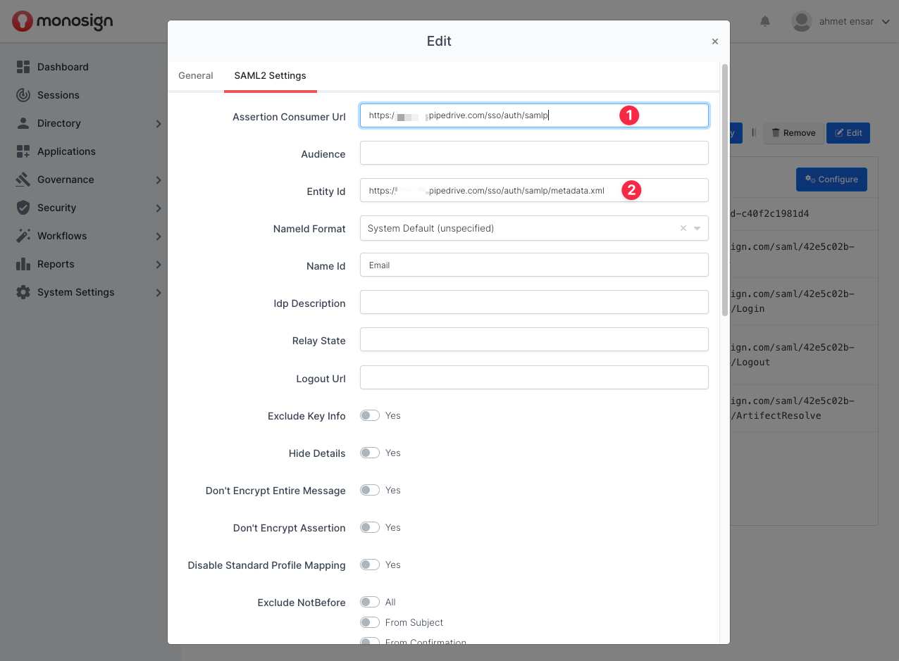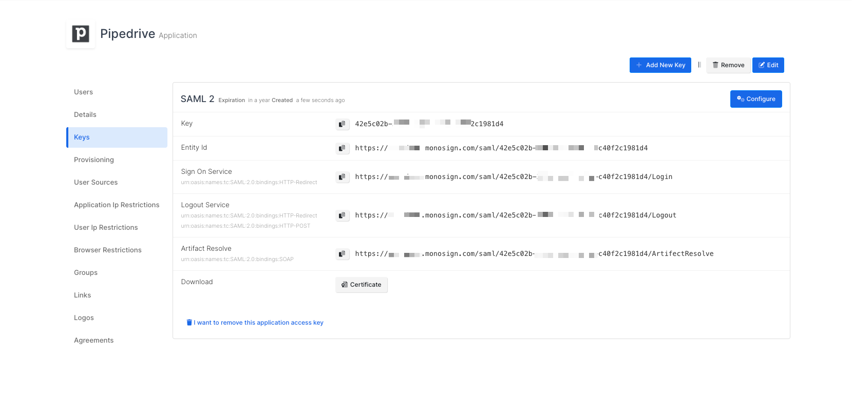 For now, we will stop here on the Pipedrive side and create a MonoSign Application and related SAML key by using the information provided by Pipedrive.