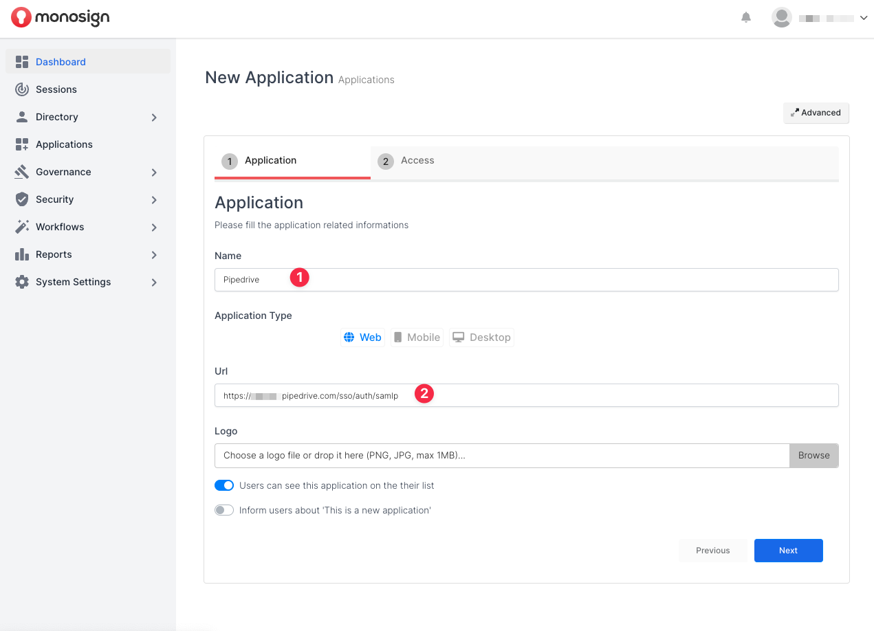 Create your application on MonoSign and make sure you typed Pipedrive SSO Sign-in URL to URL input.