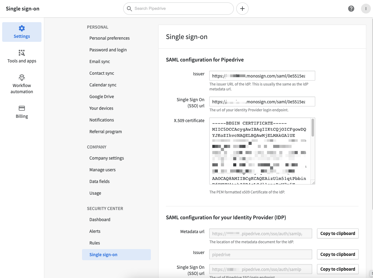 In order to configure the SAML key on MonoSign for Pipedrive SAML, you need to have various information provided by Pipedrive.