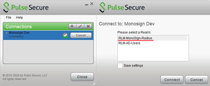 To connect, select RADIUS Authentication Realm and type your MonoSign credentials. the connection will start your MonoSign Authentication Flow.