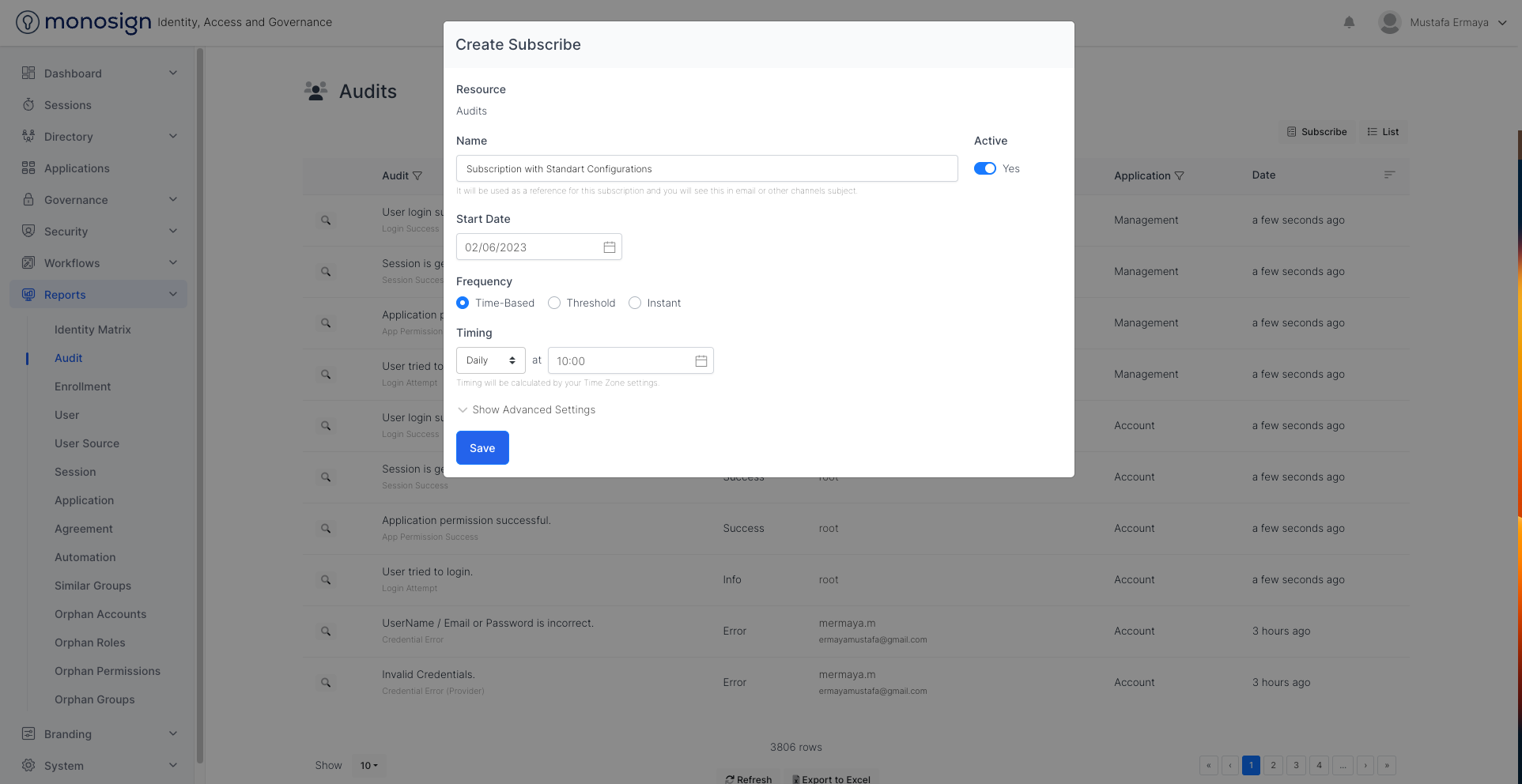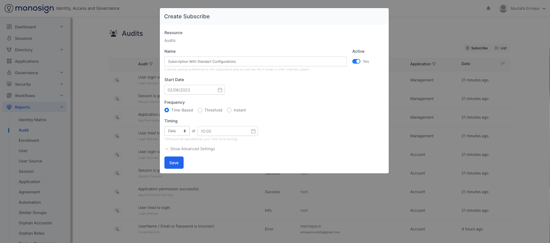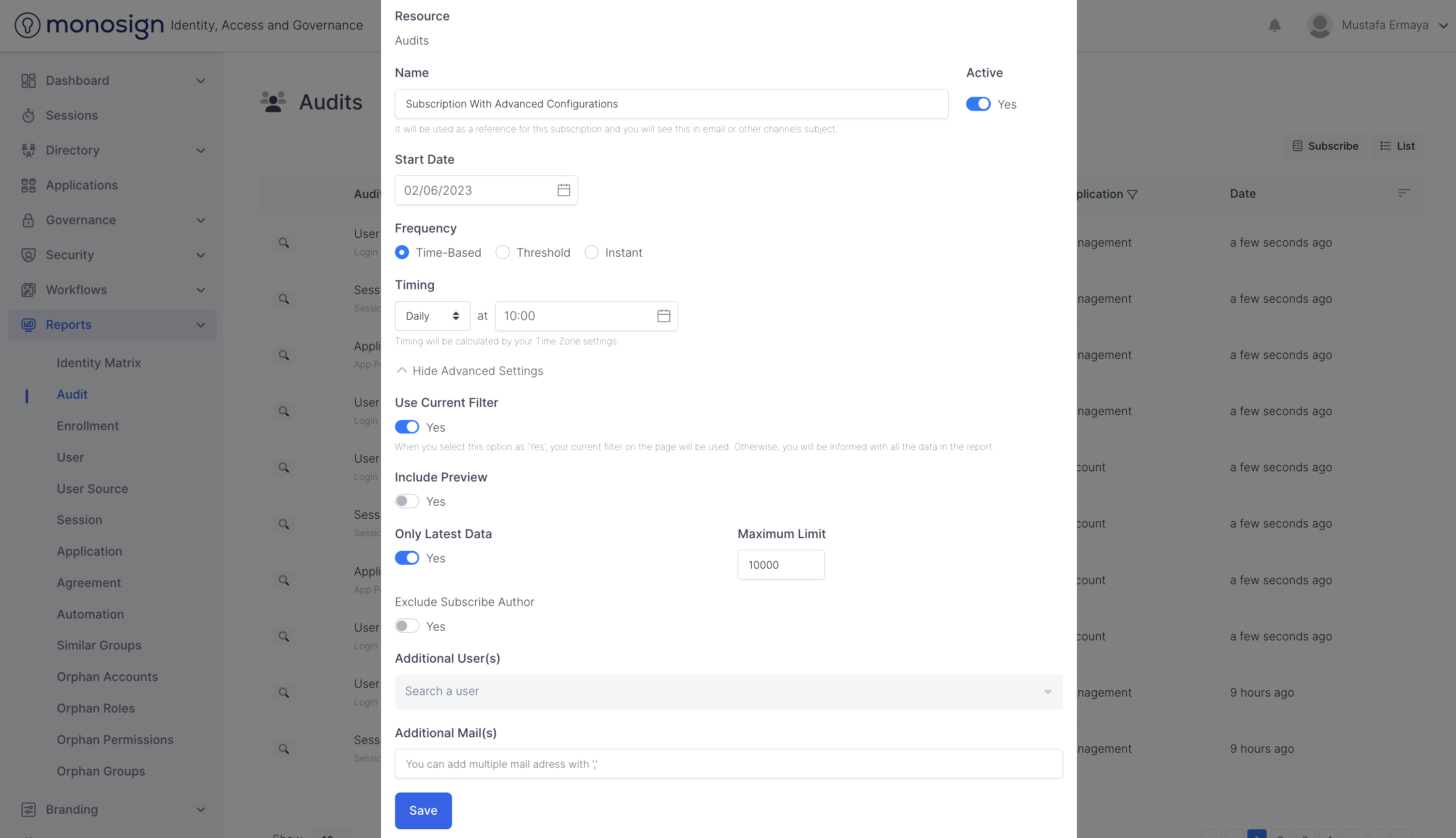 To subscribe to Audits, Navigate to Reports > Audit and click the “Subscribe“ button. Please fill all the configuration fields as shown based on your scenario.