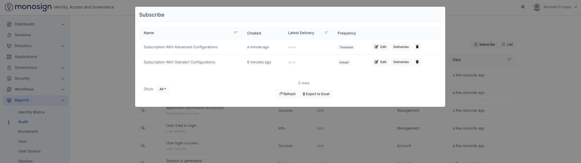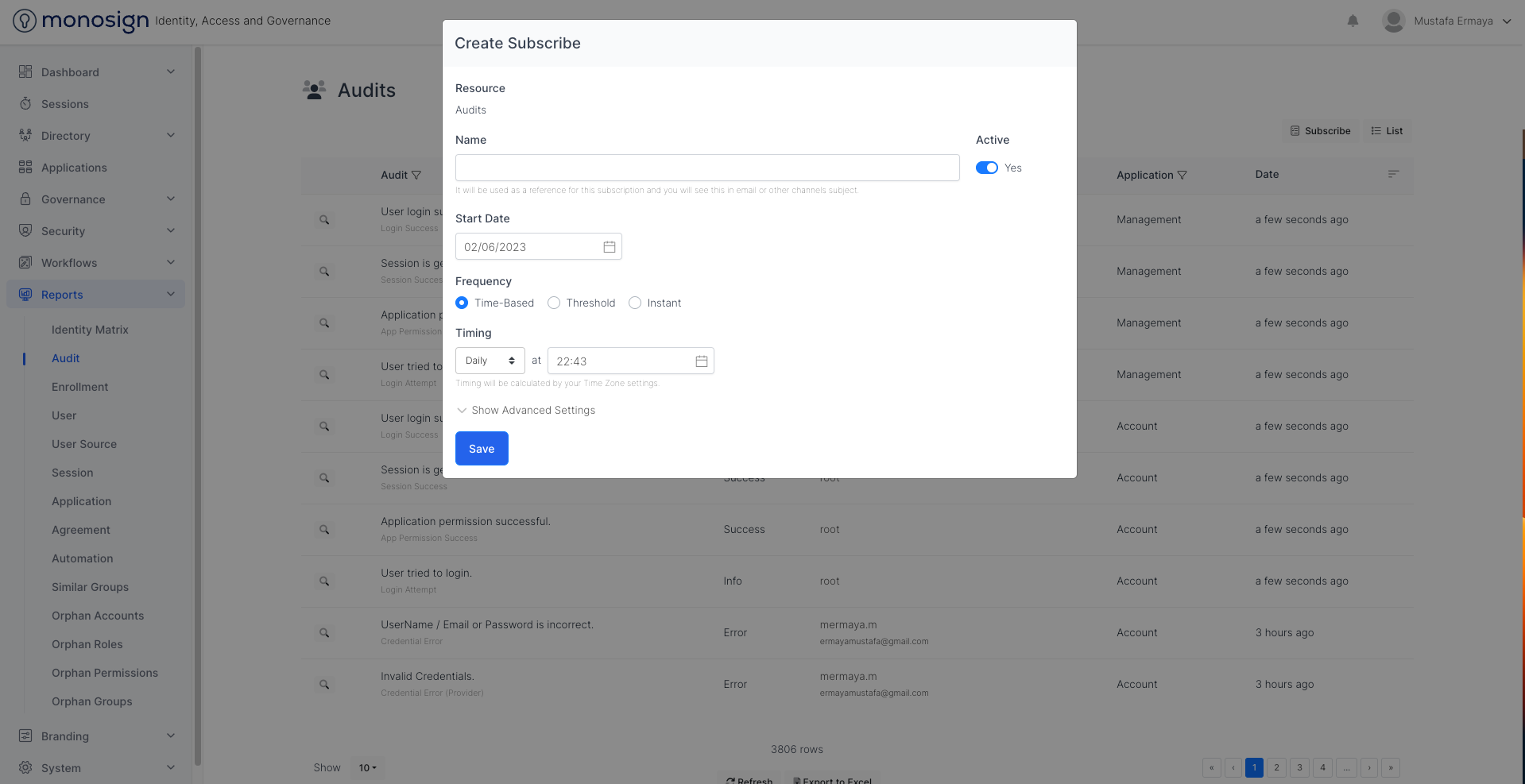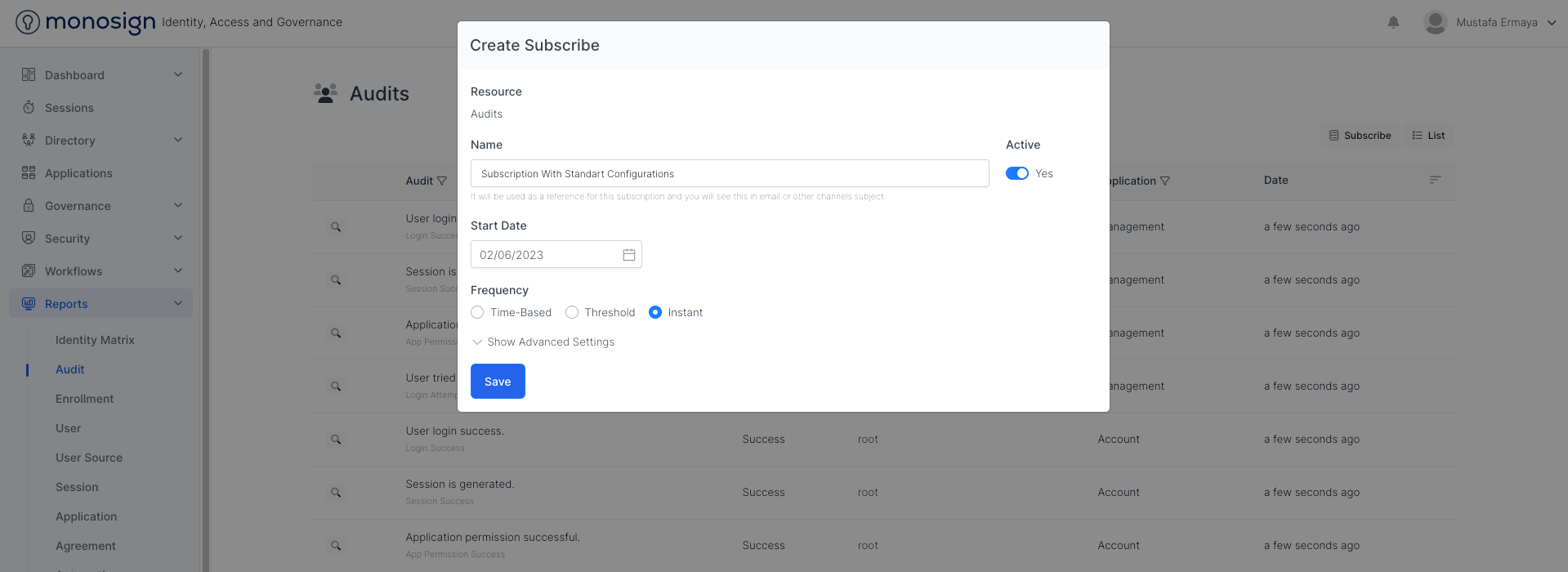 To subscribe to Audits, Navigate to Reports > Audit and click the “Subscribe“ button. Please fill all the configuration fields as shown based on your scenario.