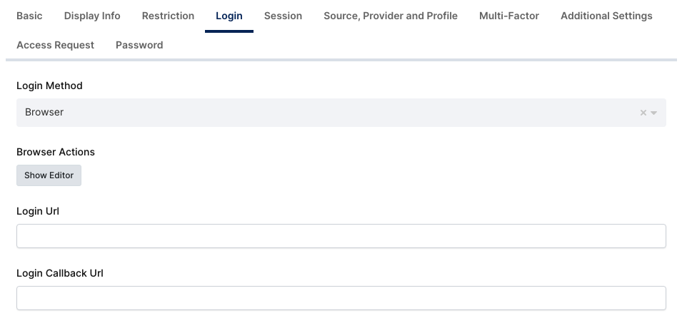 Create an Twitter application on Monosign and configure your access policy. Once you create, click the Edit button and switch to the Login tab. Select Browser as Login Method and click Show Editor to edit the authentication process.