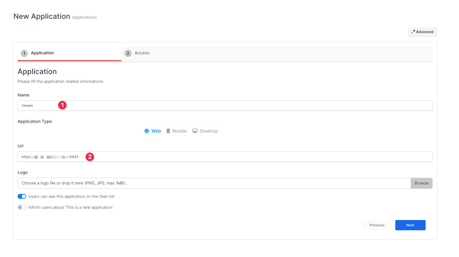 Create your application on MonoSign and make sure you typed Veeam URL to URL input.